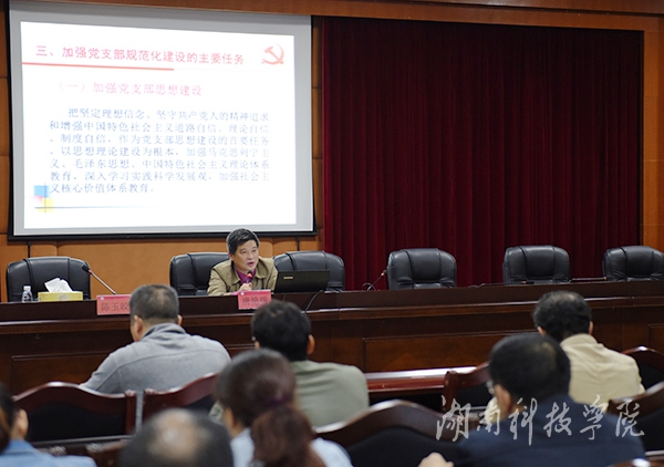 本网讯(记者 张敏杰 实习记者 李蓉 摄影 何帅文)为进一步加强党支部规范化建设,10月19日晚,校党委副书记唐艳明为各党支部书记作主题为“对照标准 严格要求 努力加强我校基层党支部规范化建设”的讲座。