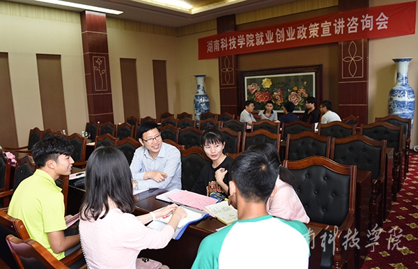永州市人力资源和社会保障局党组成员、副局长蒋新山,典盛传播、环球活动网总裁欧阳国忠代表就业创业导师发言。他们解读了相关政策,分享了自己创业经验,表示要充分利用好就业创业导师这一良好平台尽可能为同学们创业提供帮助。
