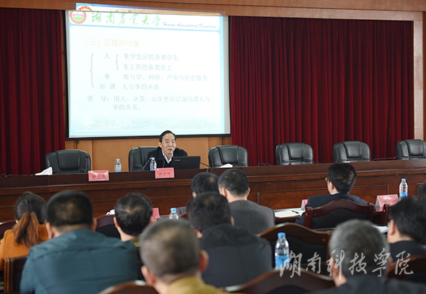 周清明从我国高校概况、高校管理和发展趋势三个方面,结合我国高校实际,特别是湖南农业大学办学实际和自己工作经历进行了深刻阐述。他认为,我国高校有四大任务,即人才培养、科学研究、社会服务、文化传承与创新;大学的职责是促进人的发展、促进社会的发展、促进经济的发展;办大学就是办一种氛围。他指出,管理就是服务,就是管理者利用党和人民赋予的人、财、物等资源的调配权恰到好处地为事业、为单位、为群众服务;就是要根据上级的要求、本单位发展的需要、群众的急需和自己的思考做好服务工作。他还就管理者自身要求、管理对象、管理理念、管理方法、管理手段、管理创新、办好大学“十要”、高校管理现状等方面进行了详细讲解。他强调,高校存在办学模式多样化、经费投入多元化、培养目标个性化、各种评估更加规范频繁、办学规模与校园建设日趋稳定等发展趋势。