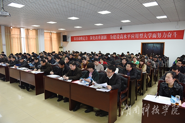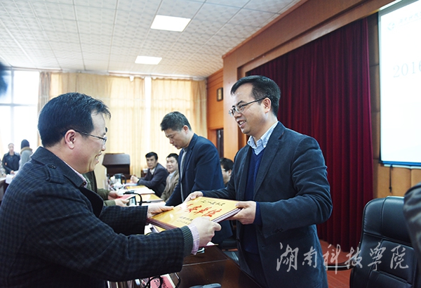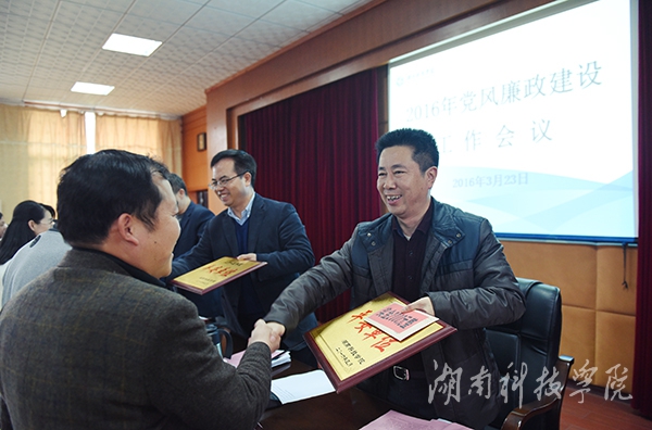 会议下发了2016年党风廉政建设和反腐败工作要点、宣传思想工作要点和综治维稳工作报告。党委副书记唐艳明宣读了《关于表彰2015年度综治维稳工作先进单位的决定》以及2015年荣获省级以上奖励的集体和个人名单。学校领导为获奖单位颁奖。全校各直属党组织负责人和各单位负责人签订并递交了《党风廉政建设目标管理责任书》、《综治维稳工作责任状》和《保密承诺书》。