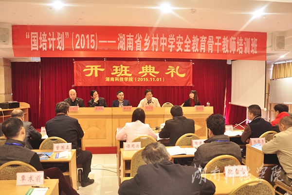 本网讯(实习记者 张婉静 王苏芮)11月1日上午,“国培计划(2015)”湖南省乡村教师访名校项目——乡村学校初中安全教育骨干教师培训班开班。副校长郑山明、省国培办主任黄佑生等领导出席。培训班为期9天,共有来自全省部分中学的70名骨干教师参训。