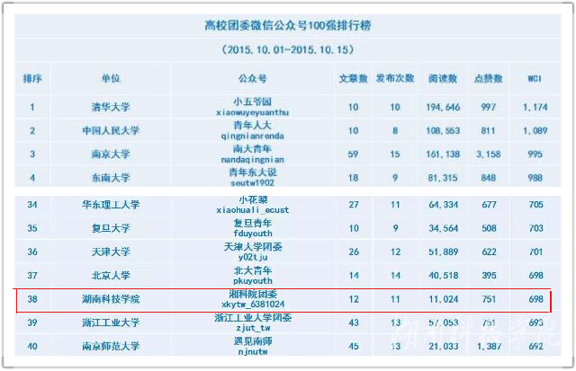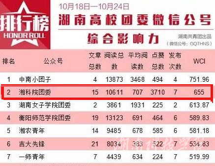 本网讯(通讯员 士心 沈俊)近日,团中央、团省委相继公布了学校共青团微信公众号影响力排行榜榜单,我校团委创建的官方微信平台“湘科院团委”(微信号:xkytw_6381024)入围全国百强,全国排名第38位,湖南省共4所高校入选百强,我校仅次于中南大学,位居全省第二。这也是我校团委微信平台第二次入围全国高校百强排行榜。