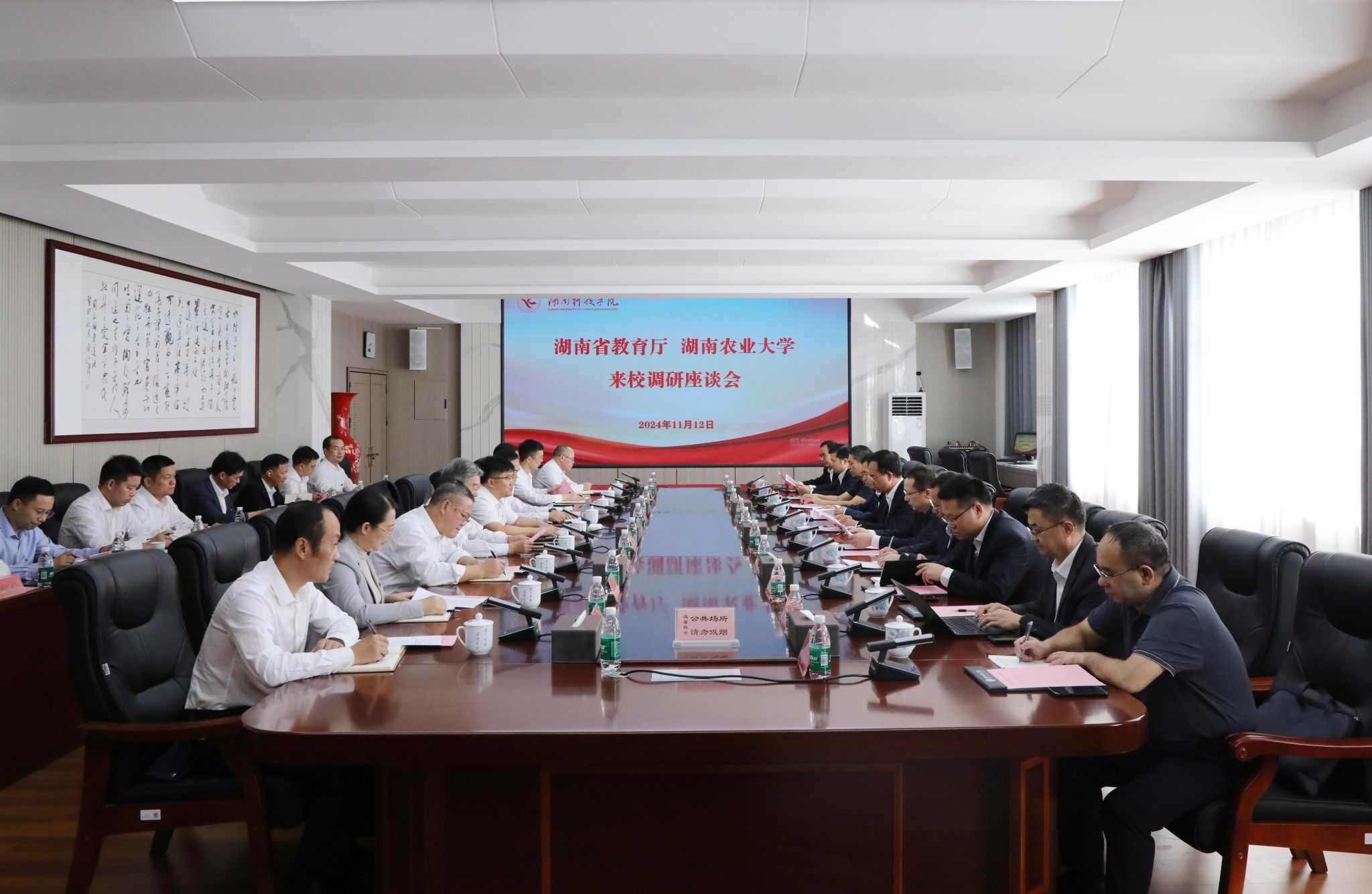 本网讯(记者 孙淑娴 赵丹 摄影 谢志豪)11月12日,湖南省教育厅党组成员、副厅长兰勇,湖南农业大学党委书记陈弘,中国工程院院士、湖南农业大学校长邹学校,湖南农业大学党委委员、副校长谢方平,湖南省教育厅高等教育处处长张平一行来我校考察调研,并进行座谈交流。我校党委书记李钢,党委副书记、校长黄创霞,校领导宋宏福、吴小林、何福林、陈灿军、郑银芳、何海,党委委员、组织部部长杨涛等陪同调研。座谈会由李钢主持。