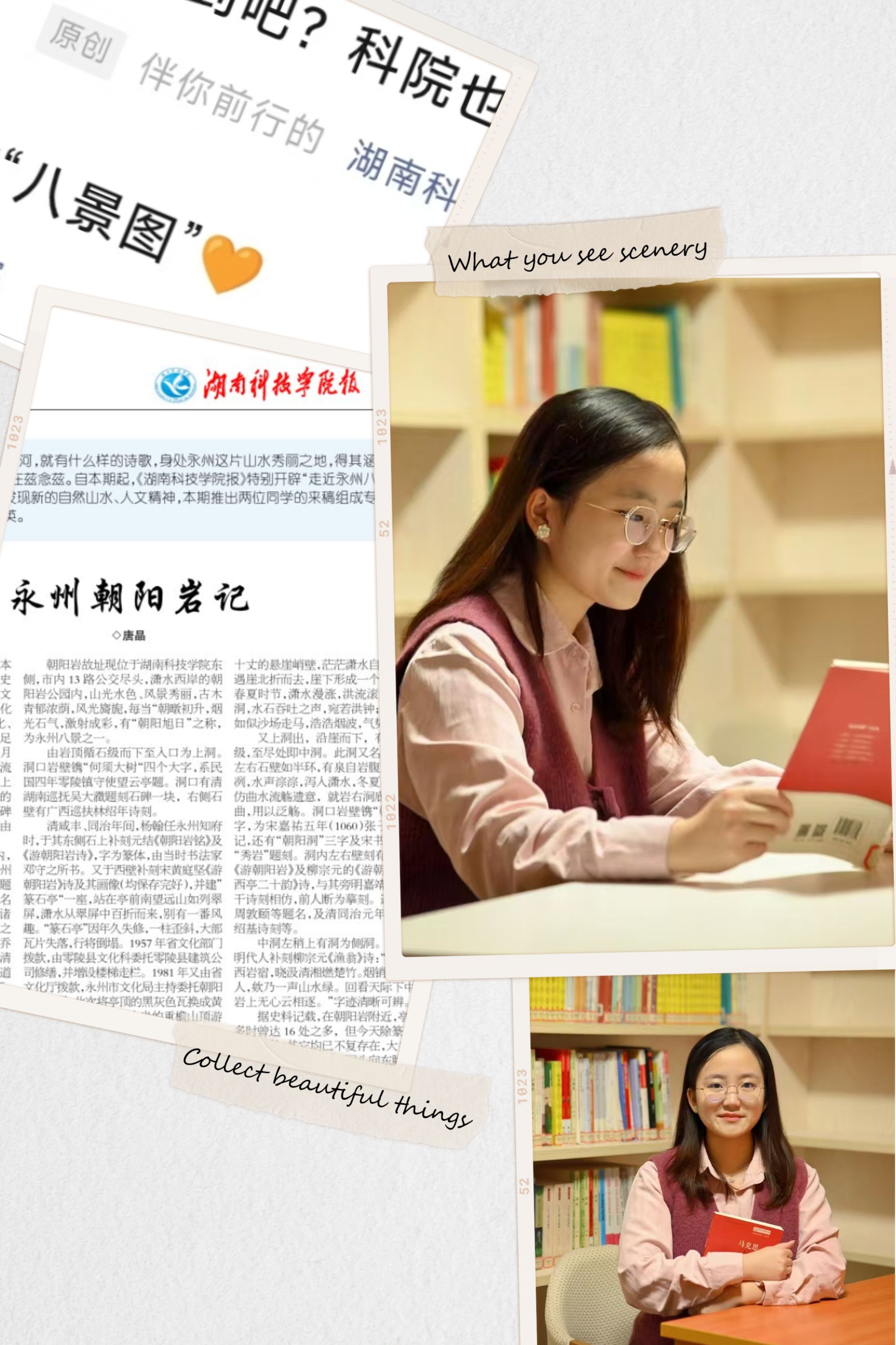 在我印象最深刻的一次创作经历中,我和十几位志同道合的伙伴共同推进并策划了一个项目——《新利·体育报》特设的“走近永州八景”专栏。我们不仅在校内发起了征稿活动,还组织了多场线下活动,旨在鼓励师生们从全新的角度探索永州的自然美景与深厚的人文精神,以此来传递永州八景丰富的文化价值。经过团队与老师们的反复讨论和精心准备,这一专栏最终赢得了校内外广泛的好评,成为了传承和推广永州文化的一股重要力量。作为此次项目的参与者之一,我深感自豪,因为这不仅是对永州八景文化的致敬,更是对我们团队努力成果的肯定。“每一份努力都藏着未来的光芒”,这句话成为了我继续前行的动力源泉。