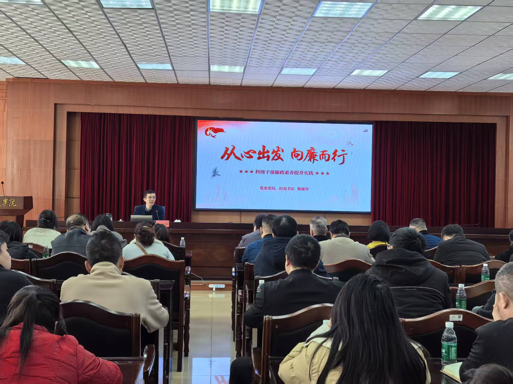 开班式结束后,校党委委员、纪委书记陈灿军作了题为《从“心”出发,向“廉”而行——高校科级干部廉政素养提升实践》的专题报告,从提高站位、筑牢廉政思想根基,明晰要义、把握廉政素养内涵,坚守底线、识别岗位廉政风险,知行合一、永葆清正廉洁本色等四个方面展开论述,他强调要从“心”出发,永葆清正廉洁的政治本色,夯实廉洁从政、廉洁从业的思想根基;向“廉”而行,争做一名让组织放心、让师生满意、让自己无愧的清正廉洁的好干部。