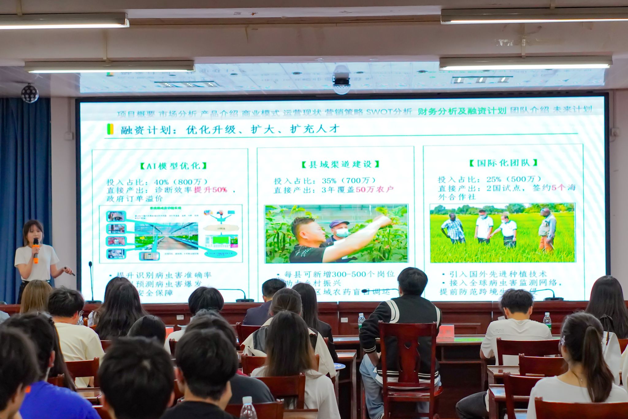 比赛现场精彩纷呈,评委从市场价值与商业模式、产品创新与技术突破、组织架构与团队能力、财务分析与融资规划、社会价值与持续发展等5个方面进行评估,综合考察参赛项目的市场潜力、创业价值及产业化前景,共评选出15个优秀项目。其中,“金穗智瞳——AI驱动的现代农业病虫害诊断系统”荣获一等奖,“以竹炭为笔,绘就乡村振兴新画卷”和“喵和计划——校园里的第三种空间”荣获二等奖,“‘麟台问策’ai智习室”、“草莓采摘机器人引领农业自动化新篇章”和“SmartAgrac-慧耕,多模态AI植保机器人”荣获三等奖。“睡眠无忧--基于脑电波监测的智能睡眠按摩枕头”等9个项目获优胜奖。