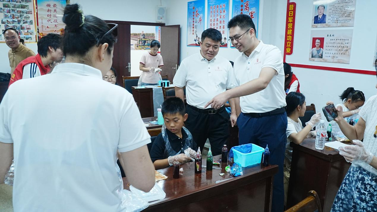 在非遗扎染体验课上,志愿者化身专业讲师,拆解扎染的经典技法,手把手教孩子们完成布料的折叠、捆扎、浸染等步骤。孩子们全心投入创作,收获了一件件图案独特的扎染作品。