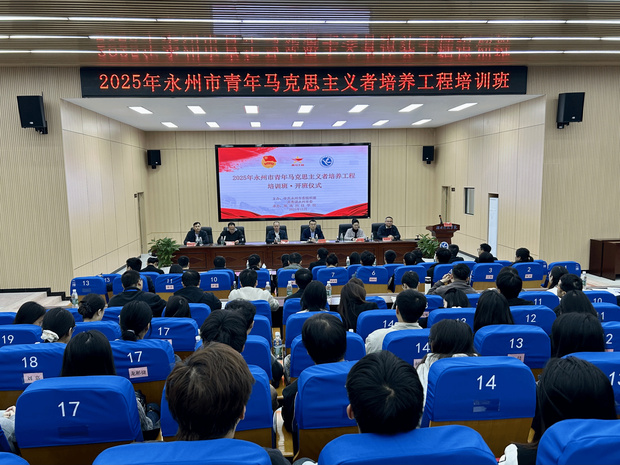 本网讯(通讯员 曹湖云 蒋滢洁)11月4日,由中共永州市委组织部、团市委联合主办的2025年永州市青年马克思主义者培养工程培训班在我校开班。校党委委员、副校长何海,团市委副书记唐泽彦、李彬彬等出席开班仪式。来自全市各乡镇(街道)及卫健、税务、国资等系统的53名团干部齐聚一堂,开启集中学习之旅。
