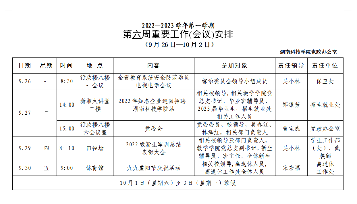 [党政办]第六周重要工作(会议)安排(9月26日—10月2日)