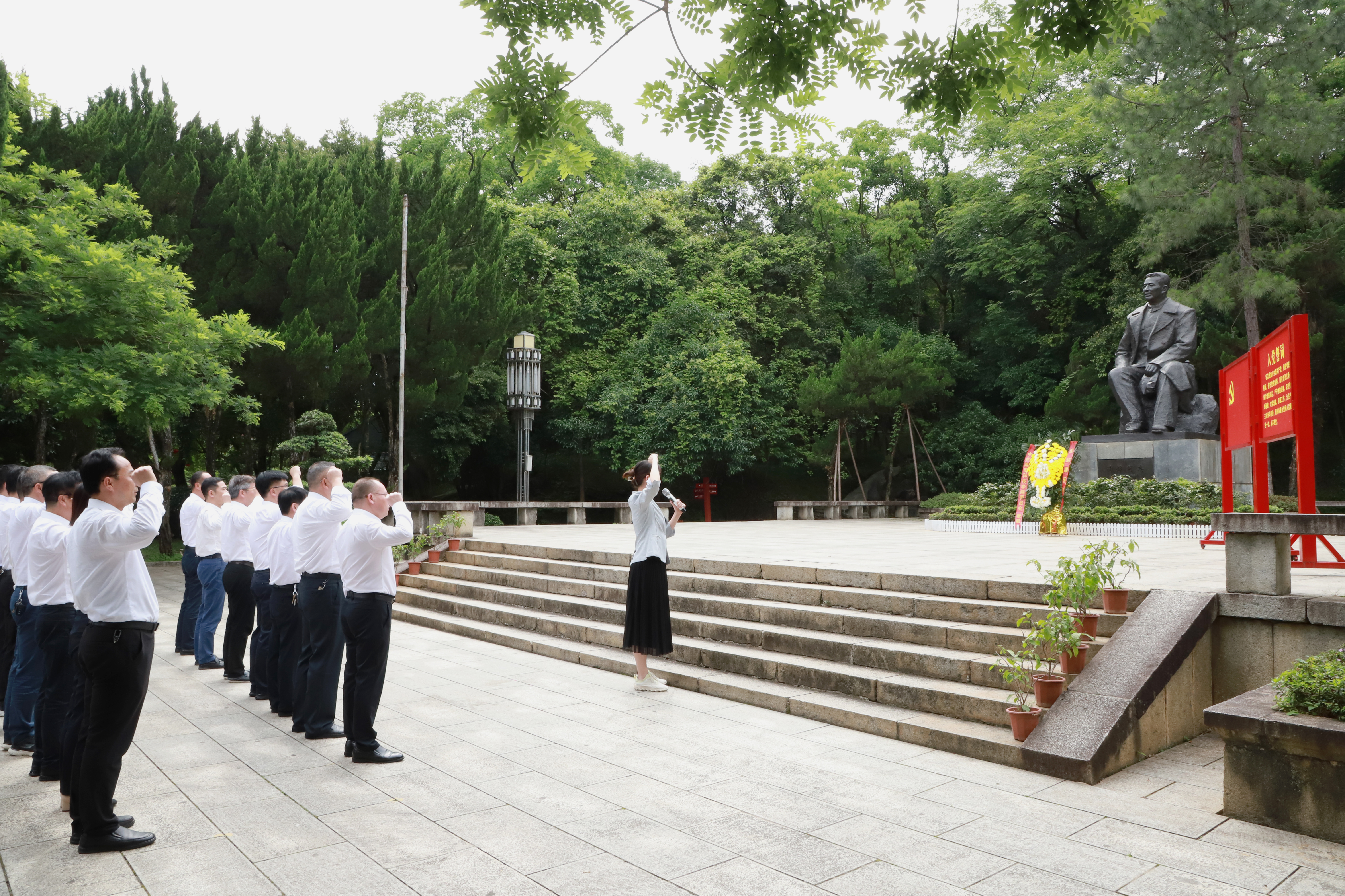 下午三时许,在陶铸同志铜像前,全体干部列队整齐,瞻仰革命前辈铜像,进献花篮、行鞠躬礼,重温入党誓词,诵读陶铸同志《松树的风格》一文。