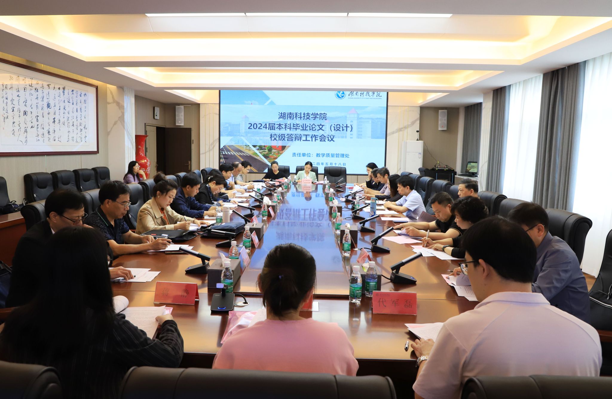 2024年本科毕业论文(设计)校级答辩按专业类别分为五组进行,聘请了校内外15名专家严格把关,随机抽取14个专业共150名毕业生进行现场答辩。答辩工作包括专家评阅论文、毕业生PPT汇报、现场答辩等三个步骤,整个答辩过程严谨有序、讨论热烈、氛围融洽。