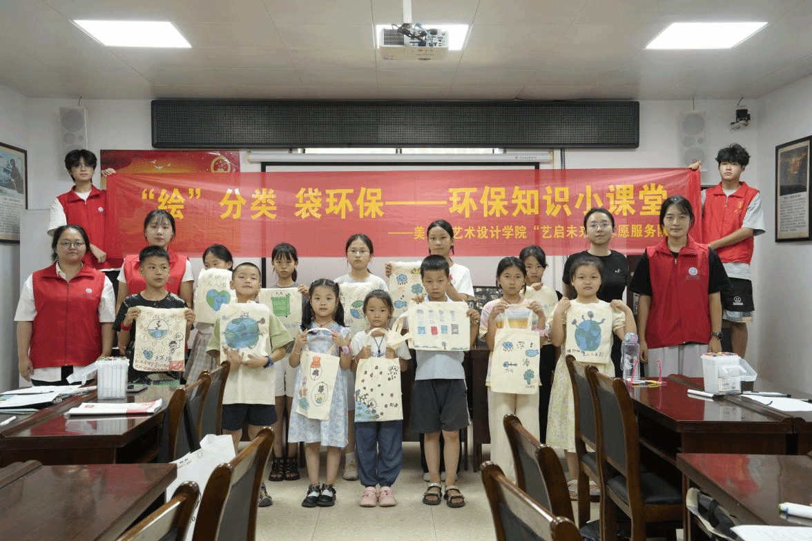 本网讯(通讯员 邓婉怡 万涛)7月16日,美术与艺术设计学院“艺启未来”志愿服务队走进湖南省永州市零陵区黄田铺镇,开展了一场别开生面的“绘分类,袋环保”主题实践活动。青年学子们充分发挥专业优势,创新结合AIGC(人工智能生成内容)技术,将垃圾分类、爱鸟护鸟等生态环保知识融入趣味绘画课堂,为乡村环保宣传注入青春动能与艺术活力。