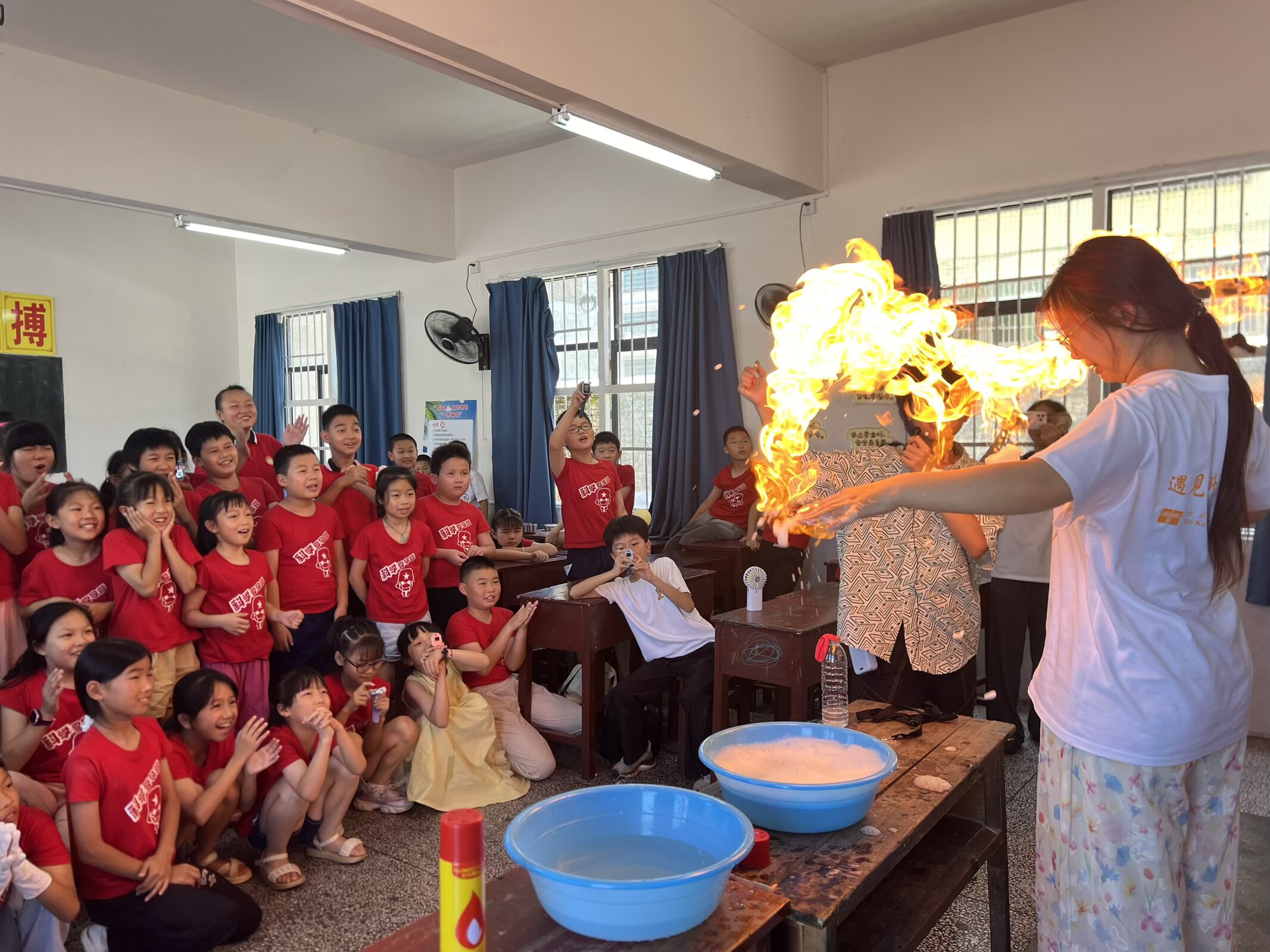 课堂上,一场场有趣的实验带领着学生们探索科学世界,志愿者在讲述实验原理,演示实验过程后,引导学生们分小组按步骤成功完成实验。
