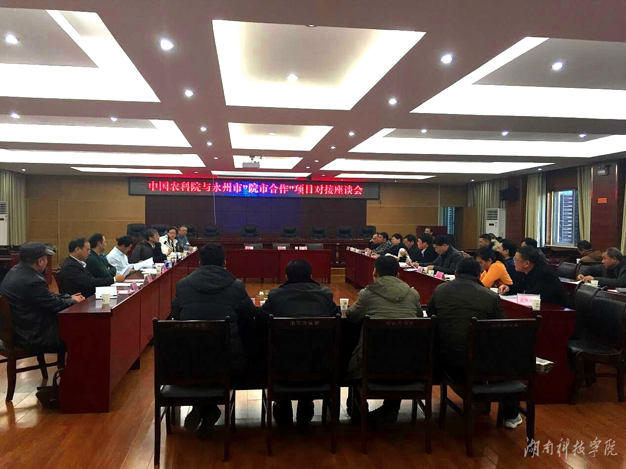 本网讯(刘小文)1月25日,中国农科院与永州市院市合作项目对接会在永州市农业委员会举行,我校作为项目成员单位参会。中国农科院植保所副所长文学、邱德文,成果转化处处长张东升,副研究员王秋霞博士,永州市政府副秘书长齐爱社,我校副校长宋宏福、化学与生物工程学院院长何福林等出席。座谈会由永州市农业委主任周善生主持。