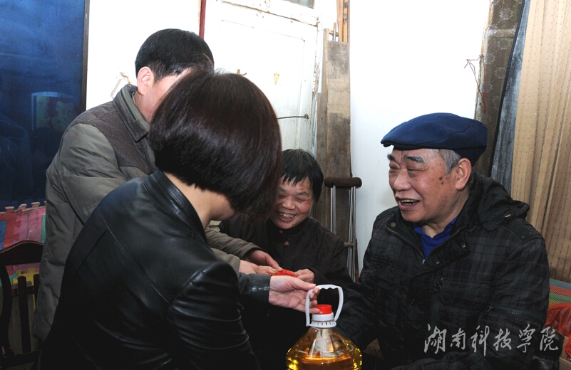 王小萃和志愿者们为孤寡老人送去食用油、大米、水果等物资,并陪老人聊天解闷,清扫街道,打扫室内卫生。81岁的老人陈伟,双目失明,生活困难,得知大家又来看望他,老人激动地走出房间迎接。“十几年来同学们定期来看我,没有间断过,感谢同学们的照顾,让我的生活充满了快乐,我感到很知足”。老人说着,脸上露出幸福的笑容。杨能山对老人说:人文与社会科学学院的每一个志愿者都是“王小萃”,是柳子街每一位老人的孩子。我们将制定相关机制,确保他们会常来看望,尽可能地提供帮助,把爱一直传递下去,把爱老敬老孝老这一核心价值观内化为每一个湘科院人的思想观念,外化为实际行动。