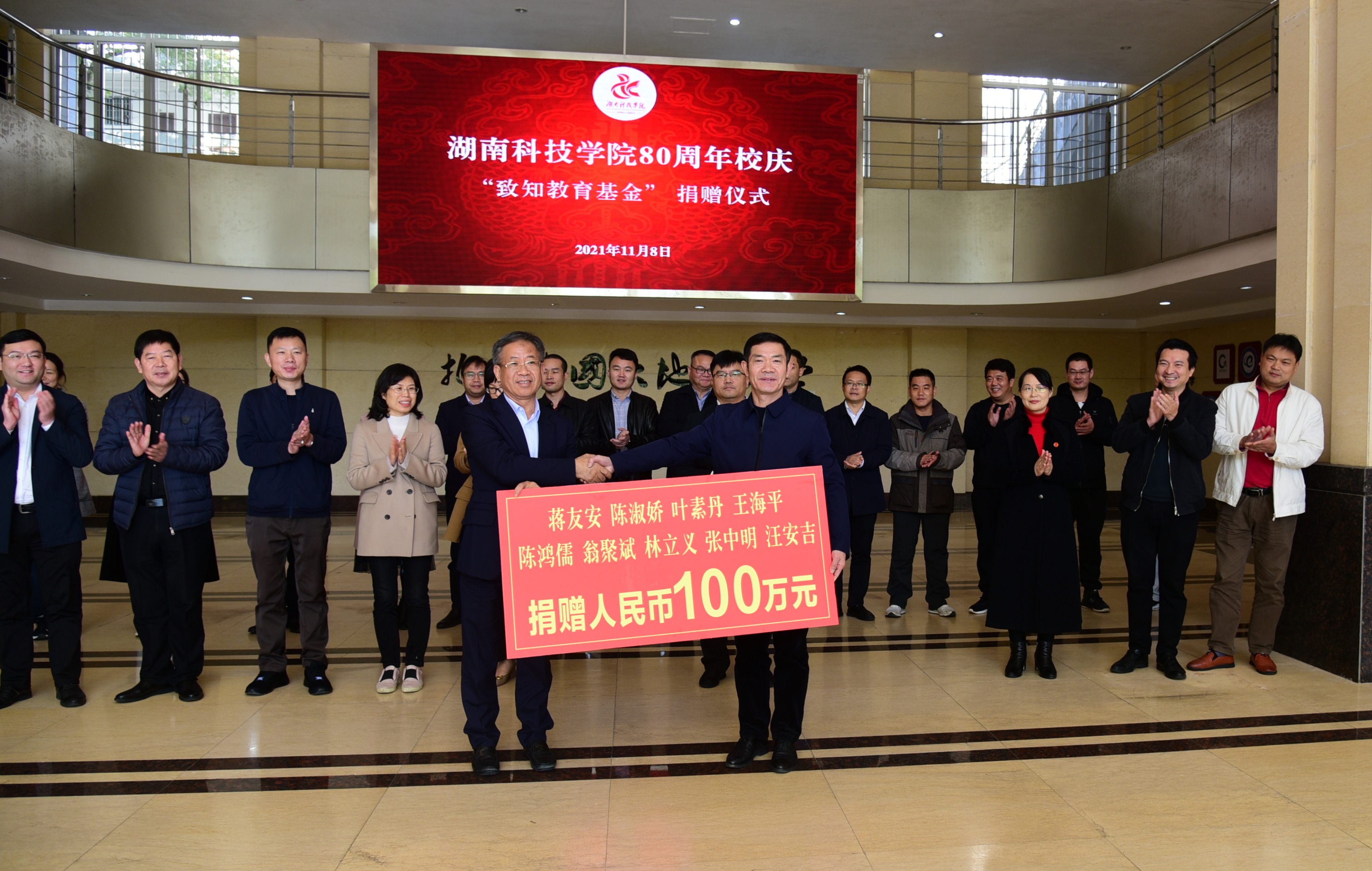 本网讯(记者 周芳梅)11月8日上午,我校举行80周年校庆“致知教育基金”捐赠仪式,温州意华接插件股份有限公司总经理蒋友安以及叶素丹女士、陈淑娇女士、王海平先生、陈鸿儒先生、翁聚斌先生、林立义先生、张中明先生、汪安吉先生九位公司高管为学校捐赠100万元,设立“致知教育基金”。校党委副书记、校长李钢,党委委员、副校长李常健,党委委员、副校长、工会主席、学校教育基金会会长吴小林,副校长郑银芳以及学校相关部门负责人,教学学院负责人,校庆办全体工作人员参加捐赠仪式。仪式由李常健主持。