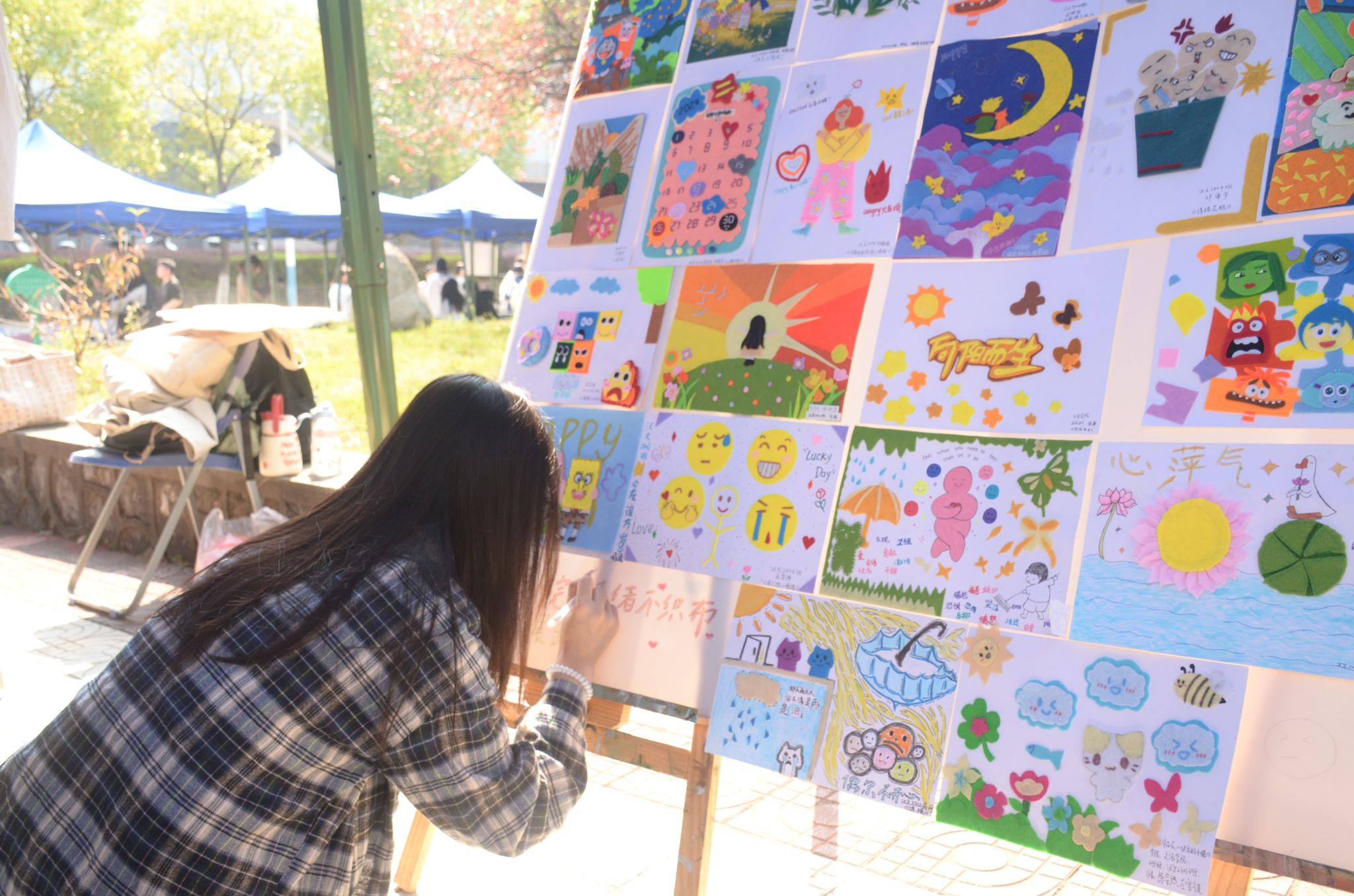 校领导与广大师生共同参与心理体验活动,并与同学们亲切交流,现场氛围轻松愉快、笑声不断。宣传活动分为心理知识展示类、心理咨询体验类、心理游戏成长类等三大类,共27项形式多样、内容丰富的心理健康教育活动,特别是还有剪纸、手工DIY、海报展示等特色活动,一系列有趣又有爱的心理健康教育活动吸引了众多学生参与其中。