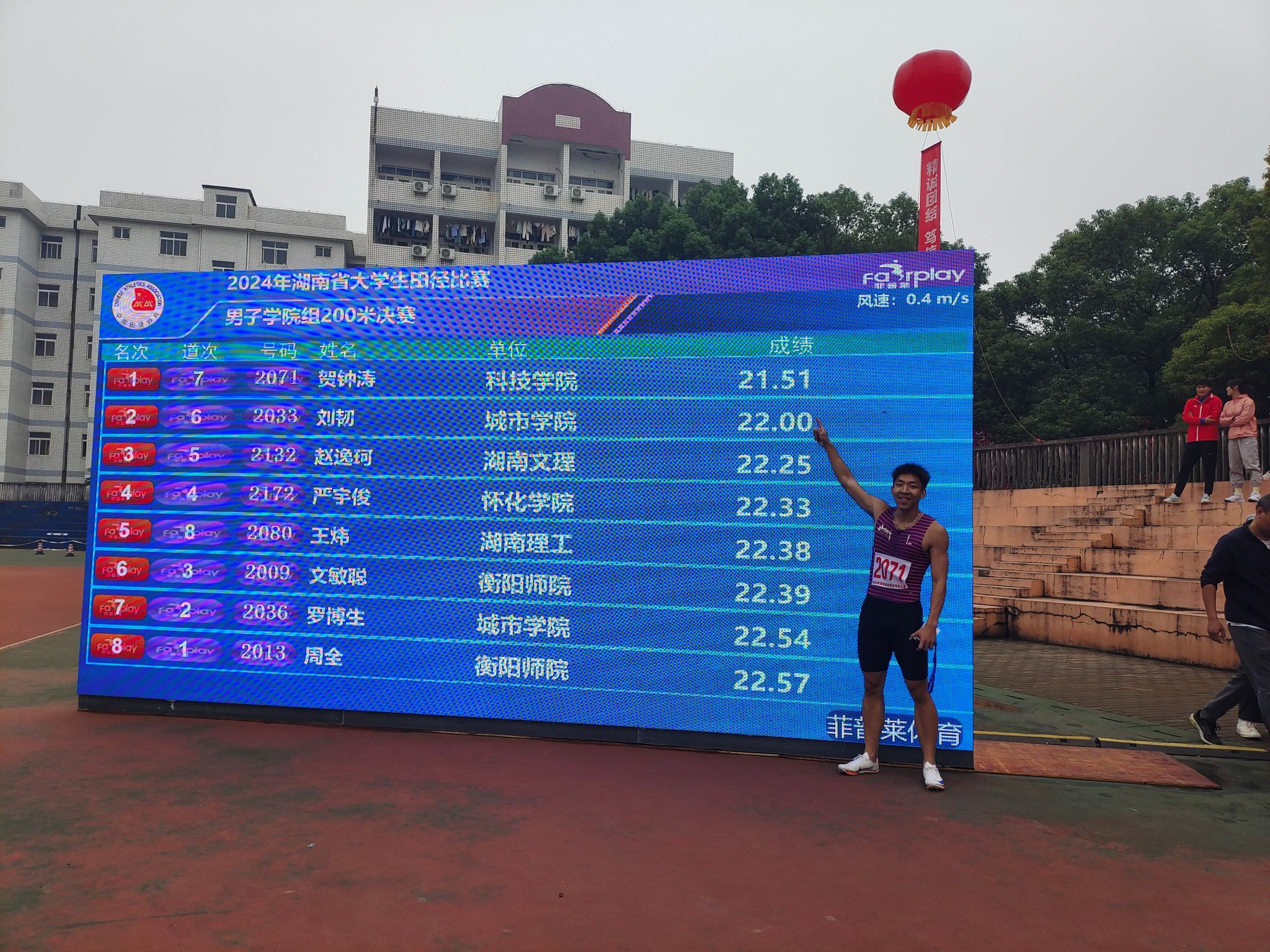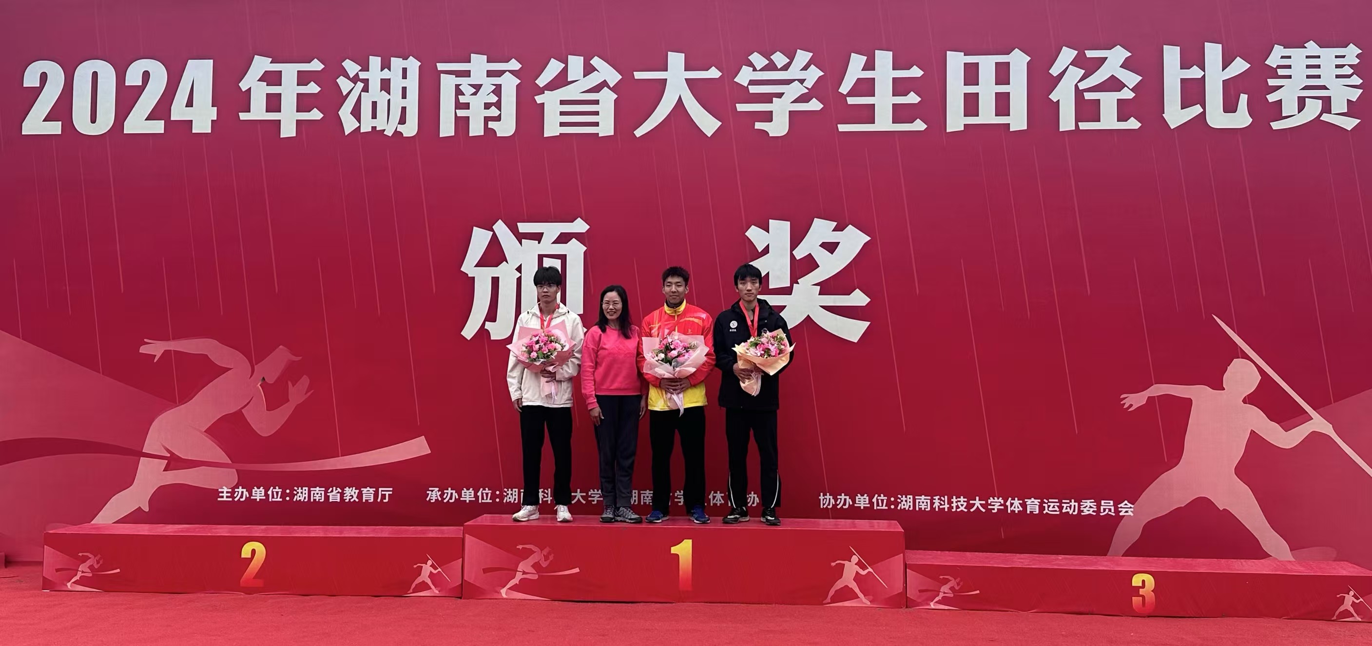 本网讯(通讯员 黄婉 贺钟涛)近日,2024年湖南省大学生田径比赛在湘潭举行。我校体育学院2022级体育教育专业学生贺钟涛过关斩将,勇夺男子学院组100米、200米双冠,实现了我校在相关体育赛事领域的历史性突破!