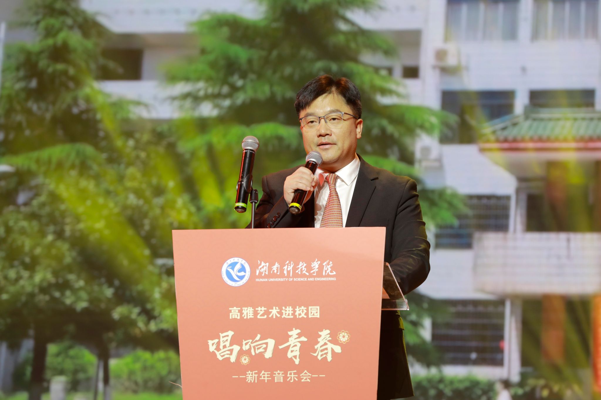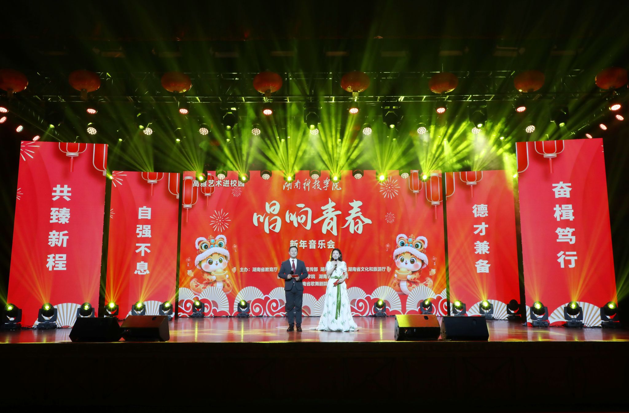 本网讯(记者 刘斌 摄影 谢志豪)12月30日晚,我校成功举办高雅艺术进校园暨2025年“唱响青春”新年音乐会。本次活动由湖南省教育厅、中共湖南省委宣传部、湖南省财政厅、湖南省文化和旅游厅主办,由湖南省歌舞剧院和我校承办。永州市人大常委会主任、党组书记蒋强先,永州市人大常委会副主任陈丽萍,冷水滩区委副书记、区长李辉,零陵区委副书记、区长龙亮,冷水滩区副区长王新丰,校党委书记李钢,党委副书记、校长黄创霞等全体在家校领导出席活动,全体教职员工及学生代表观看演出。李钢为本次新年音乐会致辞。