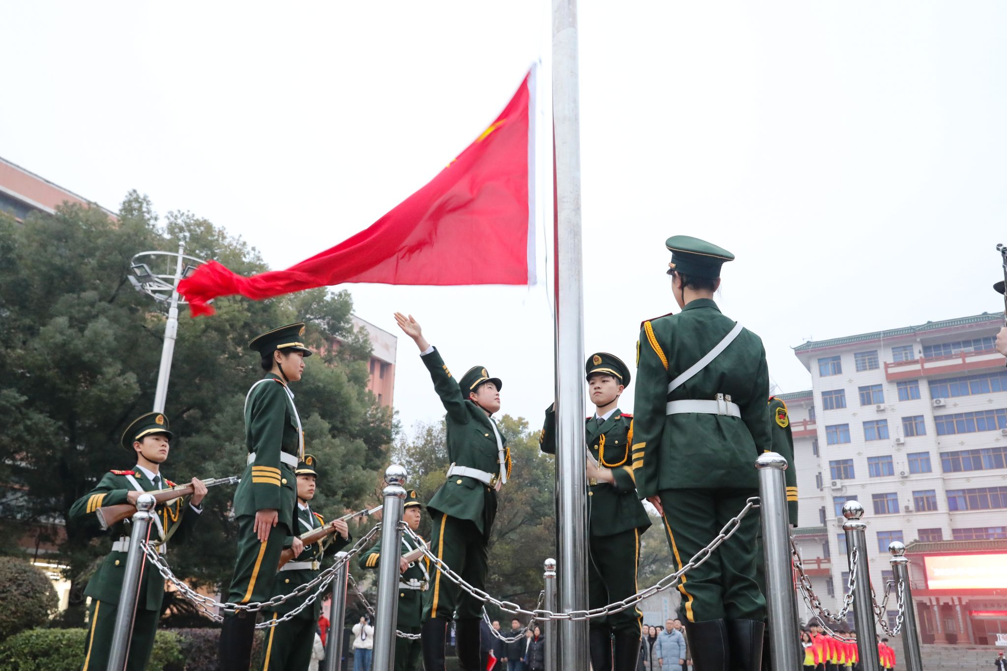 国旗护卫队迈着铿锵有力的步伐,护送国旗入场。伴随着庄严的国歌,全体师生向国旗行注目礼,鲜艳的五星红旗在晨曦中迎风飘扬。