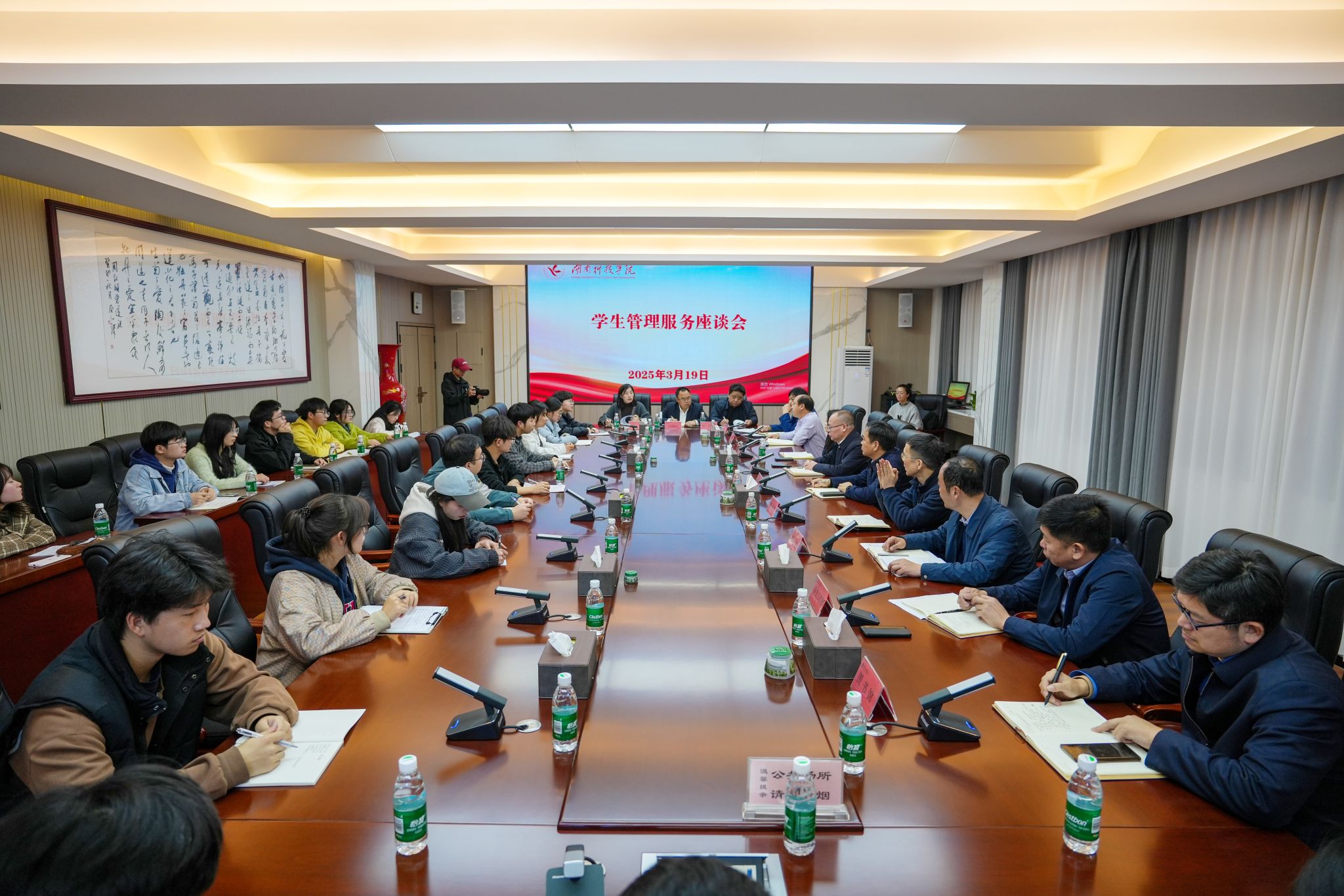 本网讯(通讯员 王子君 摄影 张倍嘉)“以学生为中心不是口号,而是师生携手践行的承诺!”3月19日晚,我校召开学生管理服务座谈会。校党委副书记、校长黄创霞,党委委员、纪委书记陈灿军,党委委员、副校长何海,党委委员、组织部部长杨涛出席会议,与来自全校各学院不同专业的30余名学生代表进行面对面座谈交谈,会议由杨涛主持。