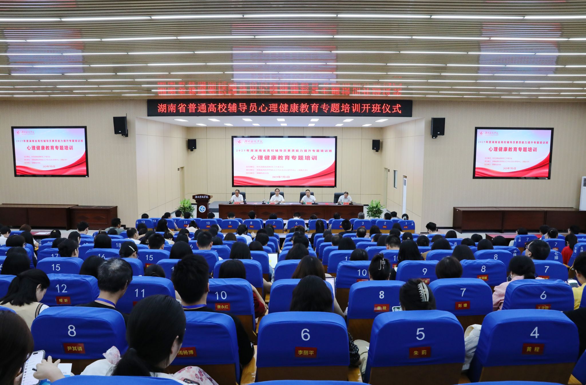 本网讯(通讯员 蔡彦婷)7月1日上午,2025年度湖南省普通高校辅导员心理健康教育专题培训班在我校举行。湖南省委教育工委宣传部部长、湖南省教育厅思政处处长许抗,校党委副书记、校长黄创霞,湖南大学党委学生工作部副部长郭少滨出席开班仪式。仪式由校党委委员、组织部部长杨涛主持。