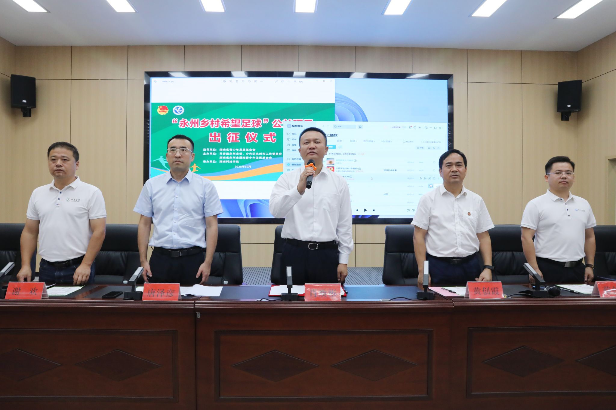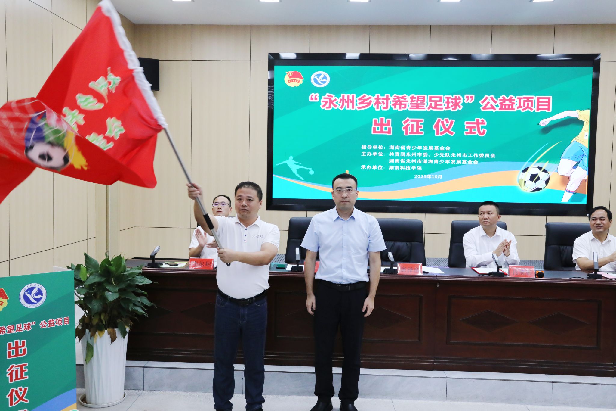 本网讯(通讯员 孙淑娴 摄影 谢志豪)10月16日上午,“永州乡村希望足球”公益项目出征仪式在学校明德楼举行。副市长肖质彬、校长黄创霞、团市委副书记李彬彬、团市委副书记唐泽彦出席出征仪式。肖质彬宣布大学生支教志愿者队伍正式出征。