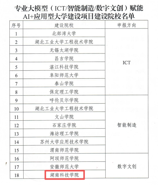 本网讯(记者 彭尧煜)近日,教育部学校规划建设发展中心发布《关于公布专业大模型(ICT/智能制造/数字文创)赋能AI+应用型大学建设项目建设院校名单的通知》,我校入选“专业大模型(数字文创)赋能AI+应用型大学建设项目”建设院校。此次全国共25所院校入选,我校是湖南省唯一入选的本科院校。