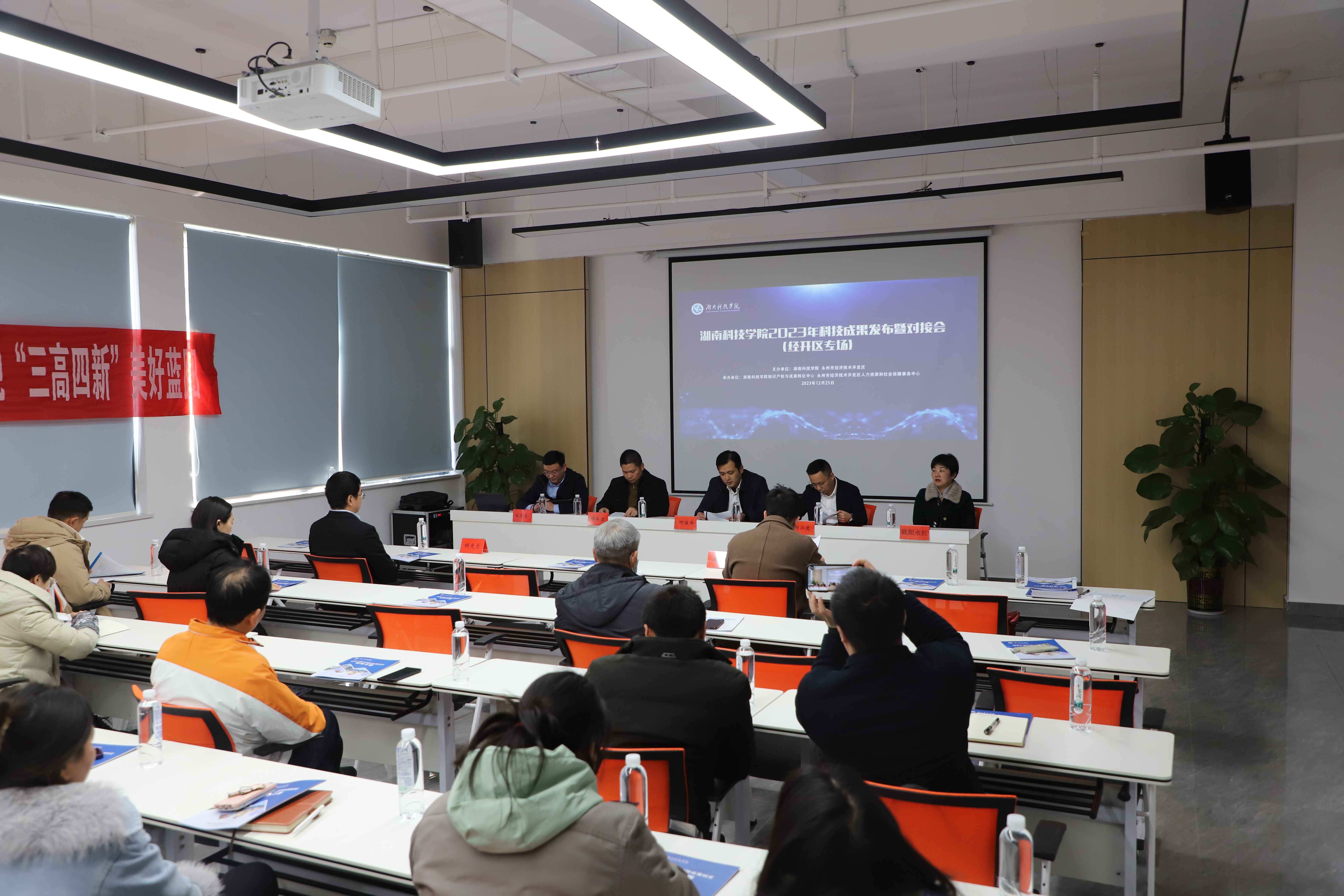本网讯 12月25日,学校2023年科技成果转化对接发布会(永州经开区专场)在永州市经开区举行,永州经济技术开发区党委委员、副主任何俊华,永州经开区人力资源和社会保障事务中心主任欧阳永红,学校科技处处长刘小文出席会议。