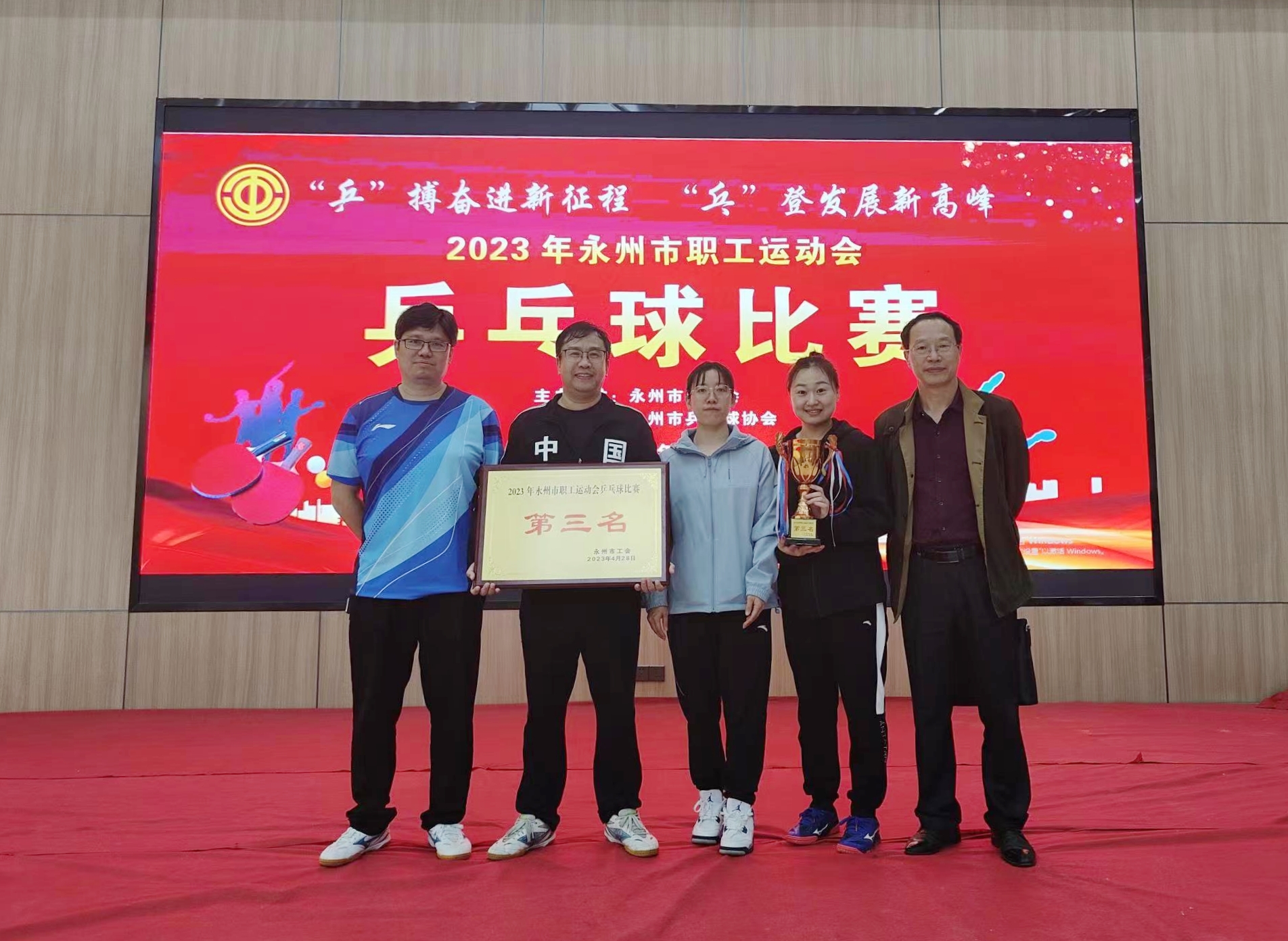 本网讯 4月26日至29日,2023年永州市职工运动会乒乓球比赛在市工人文化宫举行,共有来自全市40支队伍的200名选手参赛。我校党委委员、副校长吴小林担任领队,工会常务副主席潘剑锋担任教练,石循忠、黎建军、欧红星、陈紫菁、苏阳阳积极参赛。在比赛中大家齐心协力,不畏强敌,努力拼搏,赛出风格,赛出成绩,经过分组循环、淘汰赛,最后斩获团体第3名。