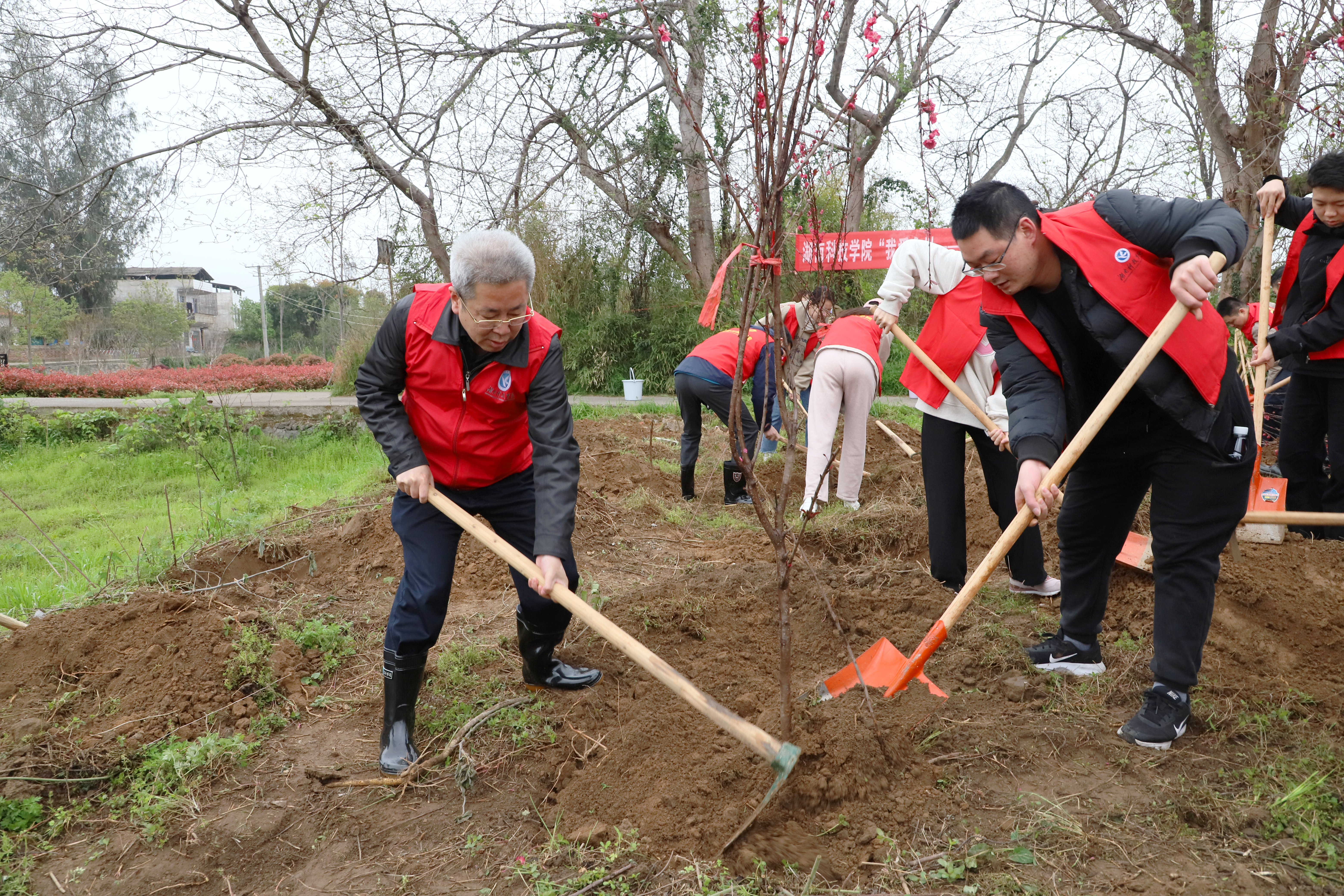 挖坑、植苗、填土、浇水……在茆江桥社区,校领导和师生们纷纷撸起袖子栽种树苗,为美丽永州种下一株绿色,增添一份绿意。分配好铲子和水桶等劳动工具后,大家按照树苗栽植的每道工序,合力种下一棵棵桃树,热情高涨,干劲十足,一番热火朝天的忙碌之后,共种植桃树40余株。新栽植的树苗整齐排列,昂然挺立,昂然挺立,萌发出盎然生机。