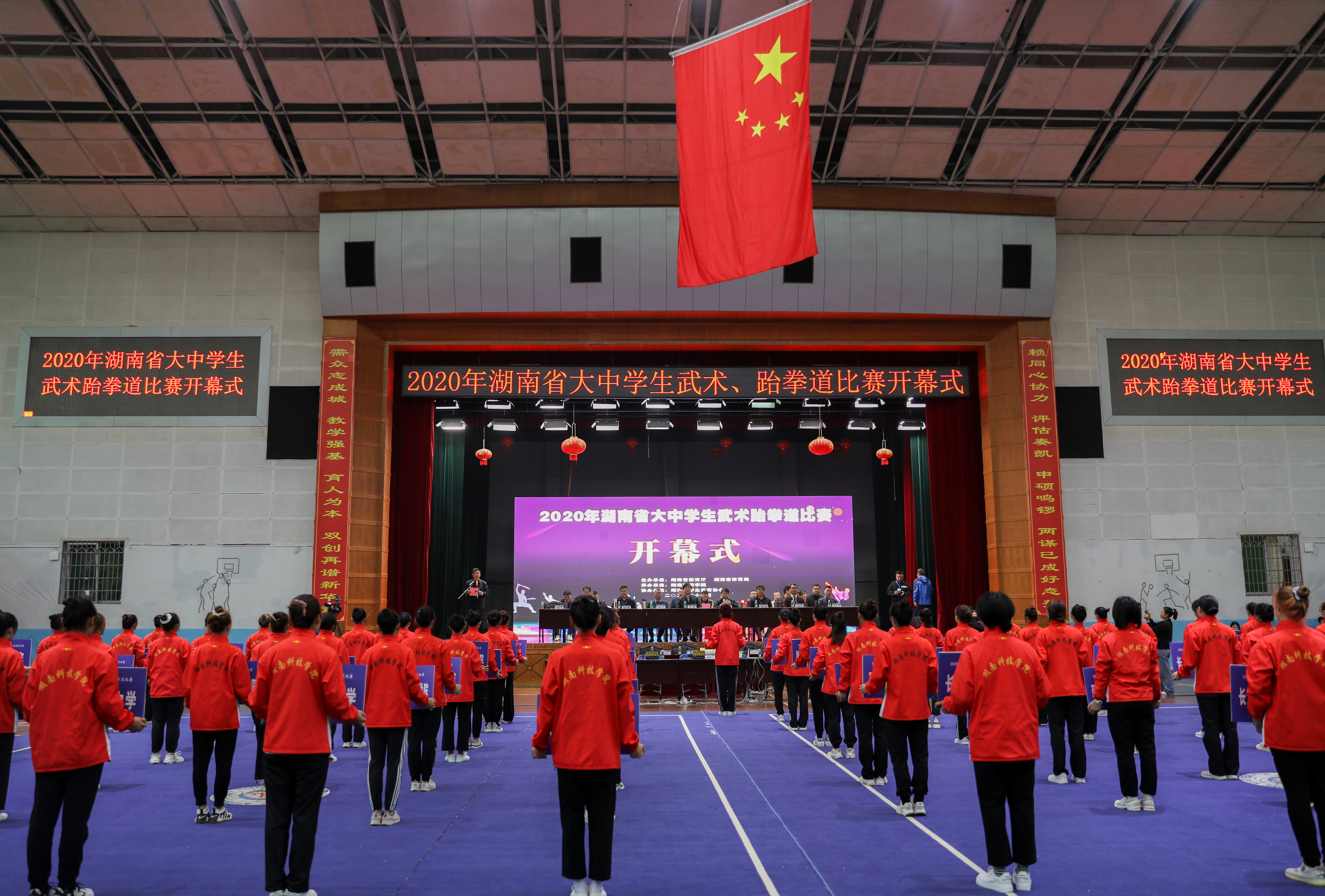 本网讯(记者 陈斯静 实习记者 陈丽杰)11月21日上午,2020年湖南省大中学生武术、跆拳道比赛在我校开幕,来自全省70所大中学校的94支代表队894名运动员参加。