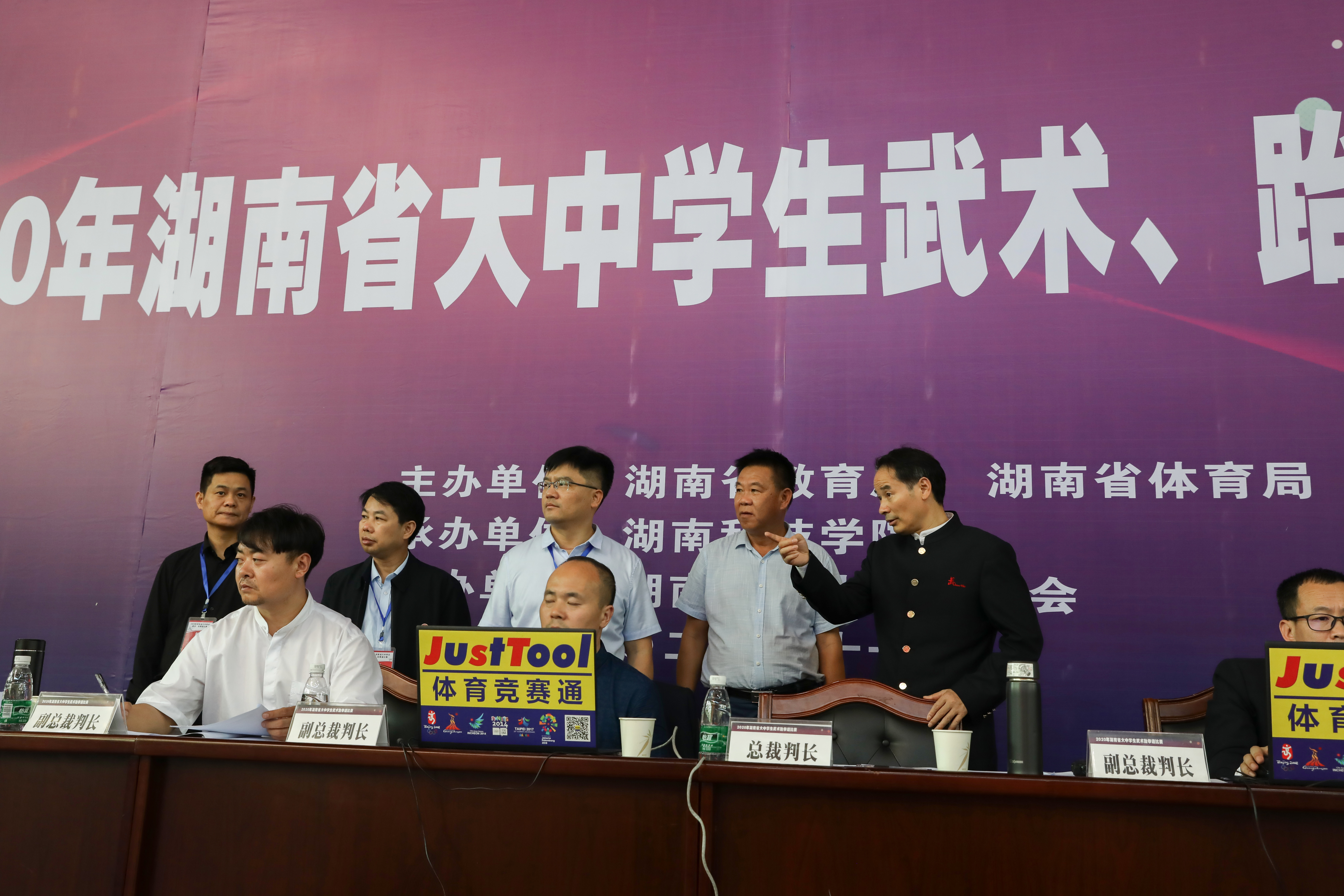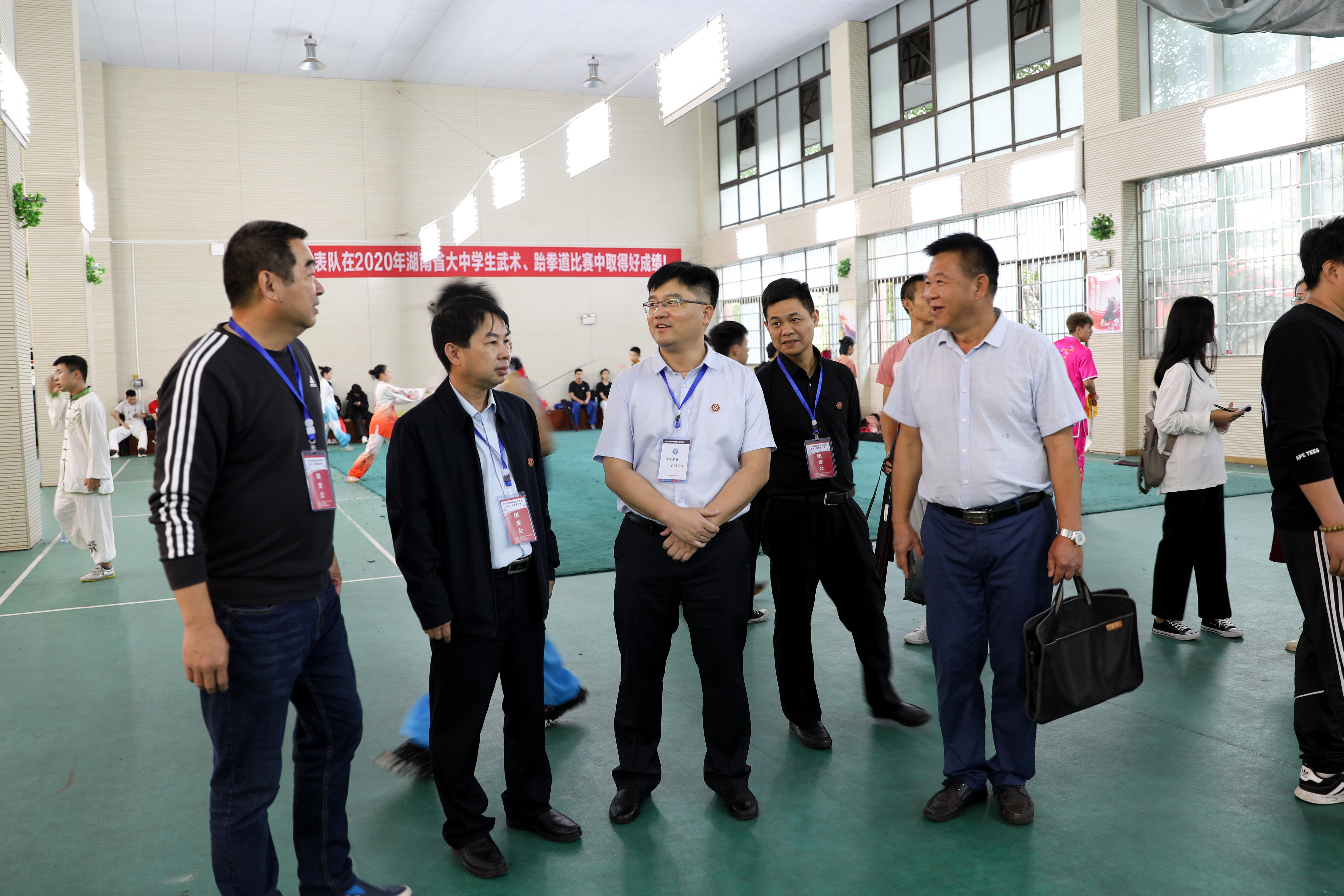 本网讯 11月19日,2020年湖南省大中学生武术、跆拳道比赛在我校正式开赛。当天下午,校长李钢、副校长李常健一行来到体育馆,观摩正在进行的武术比赛。