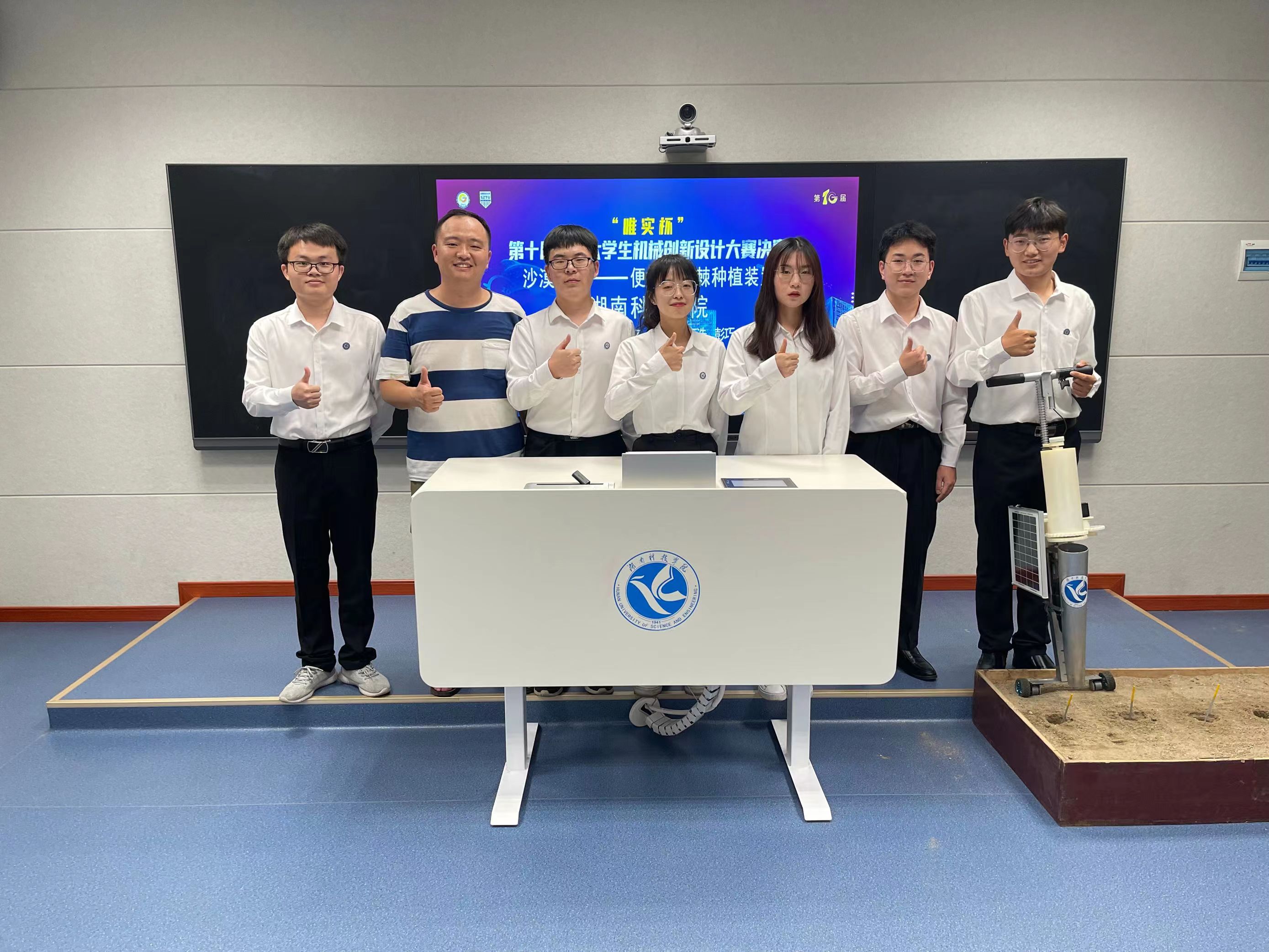 本网讯 近日,第十届全国大学生机械创新设计大赛在深圳技术大学落下帷幕,由智能制造学院罗哲、邓述为老师指导,王豪、代忆、吴顺庆、丁浩、彭巧同学制作的“沙漠克星——便携式沙棘种植装置”荣获全国一等奖,实现了我校在该类赛项获得国家级奖项零的突破。