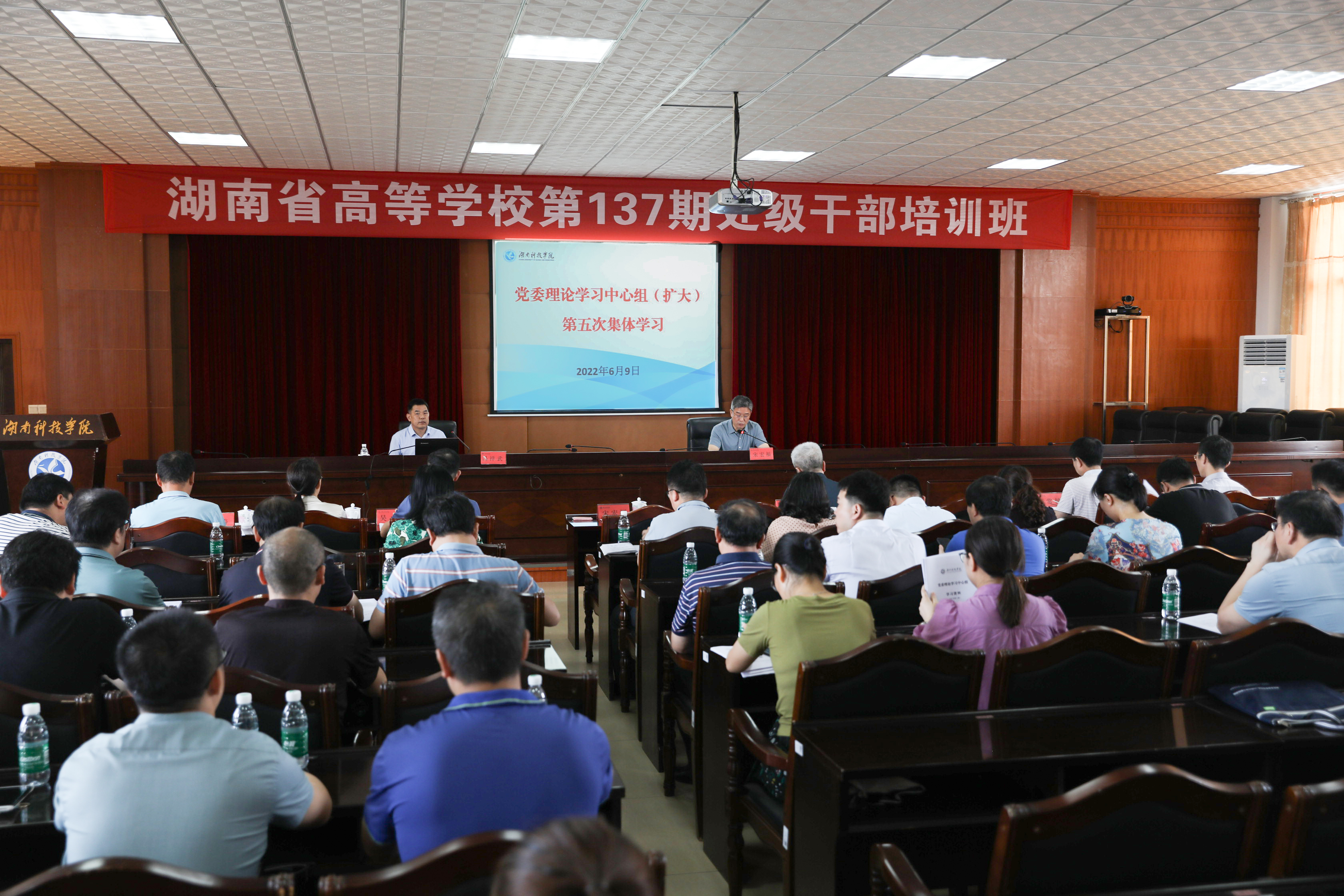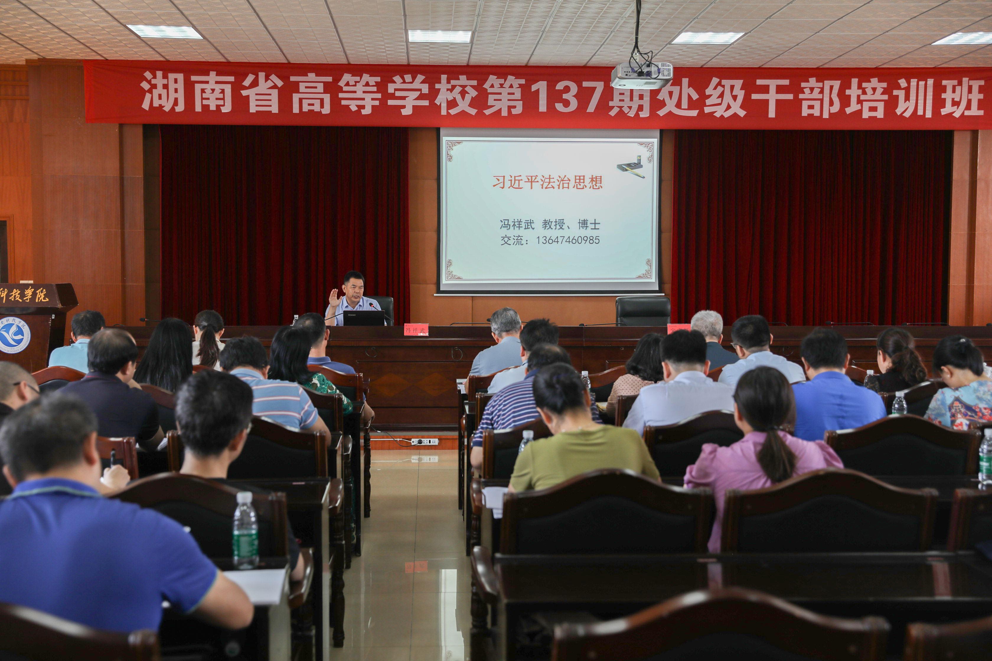 本网讯 6月9日,学校举行党委理论学习中心组(扩大)2022年第五次集体学习暨湖南省高等学校第137期处级干部培训班第九次理论讲座,邀请永州市委党校法学教研部主任冯祥武为全体在家校领导、党委委员以及处干班学员讲授《习近平法治思想》。