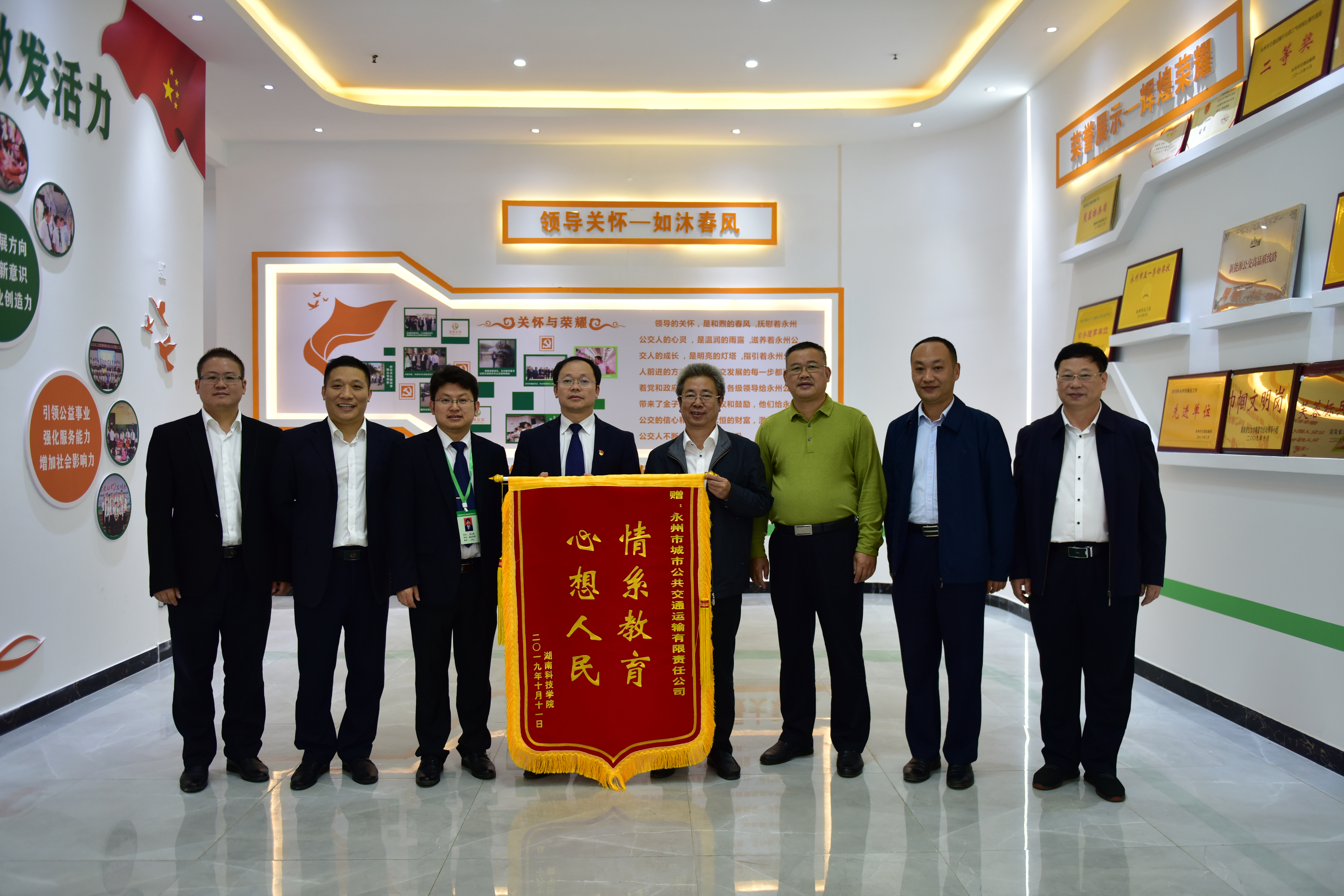 本网讯 10月15日,党委书记曾宝成前往永州市公交公司,把一面绣有“情系教育 心想人民”的锦旗送到该公司党委副书记、总经理蒋俊手中,感谢该公司今年8月开通新利·体育至永州火车站303路公交车,为师生出行提供便利。党委委员、组织部长何福林,党委委员、宣传部长杨涛,学工部长唐华山参加赠旗仪式。