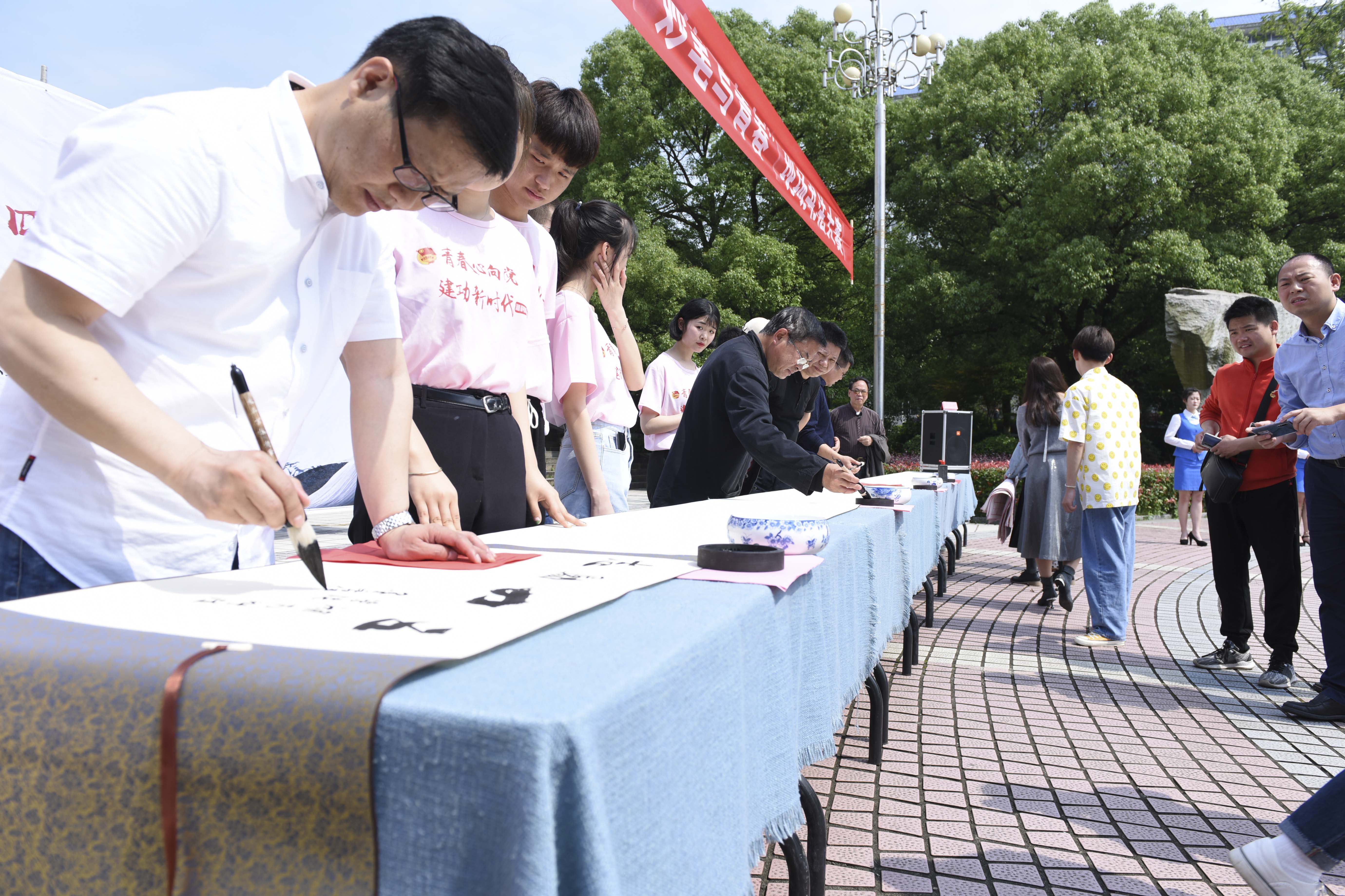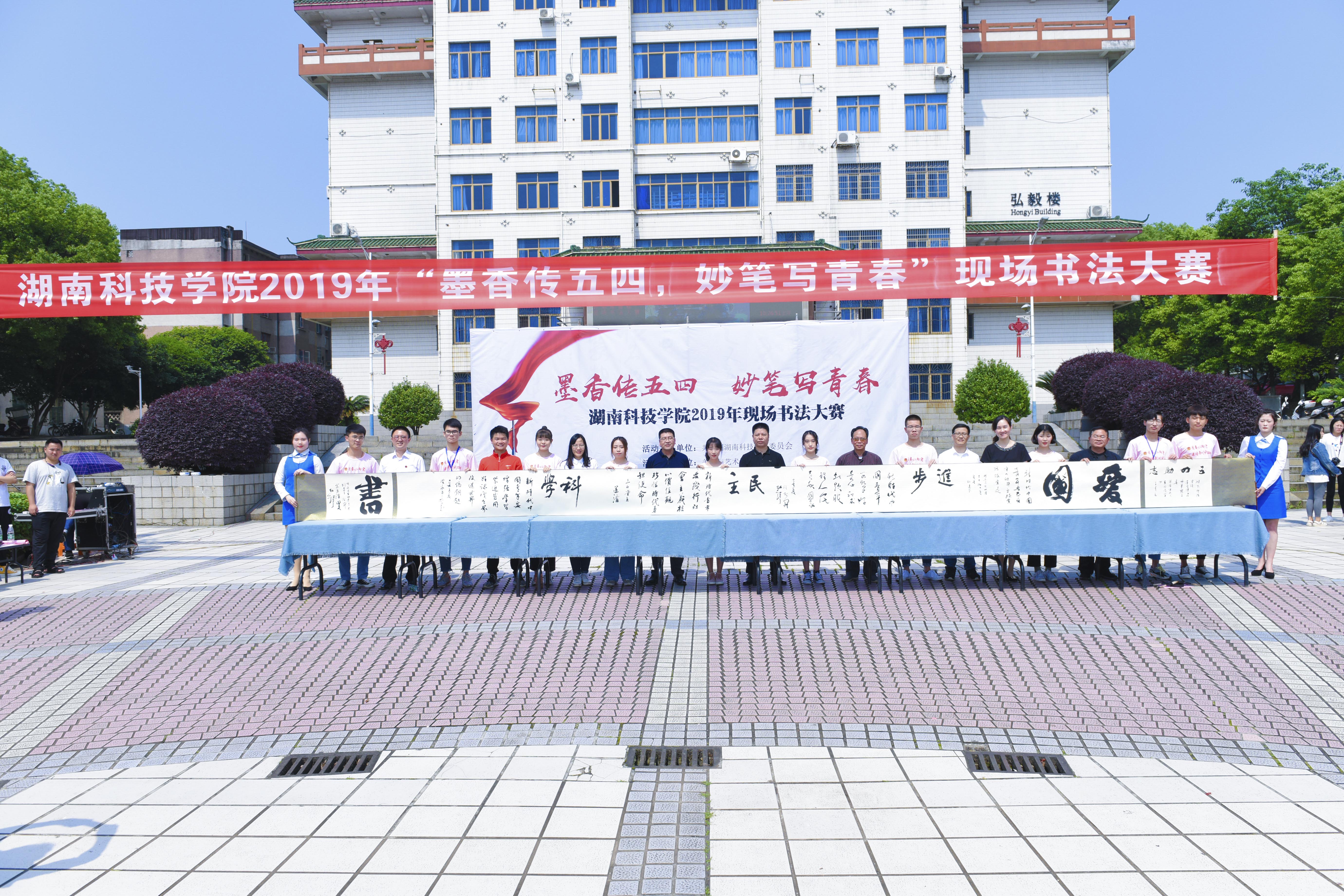 本网讯 5月11日,伴随着悠扬、古典的音乐,我校 “墨香传五四,妙笔写青春"现场书法大赛在文化广场举行,大赛吸引了近百余名师生同场竞技。副校长程智开,中国书法协会会员、湖南省书法家协会理事、湖南省书法家协会行书委员会秘书长刘建平,永州市书法家协会第一届主席黎笃田,永州市书法协会副主席宋运清,我校书法研究所所长唐幼铎参加活动。
