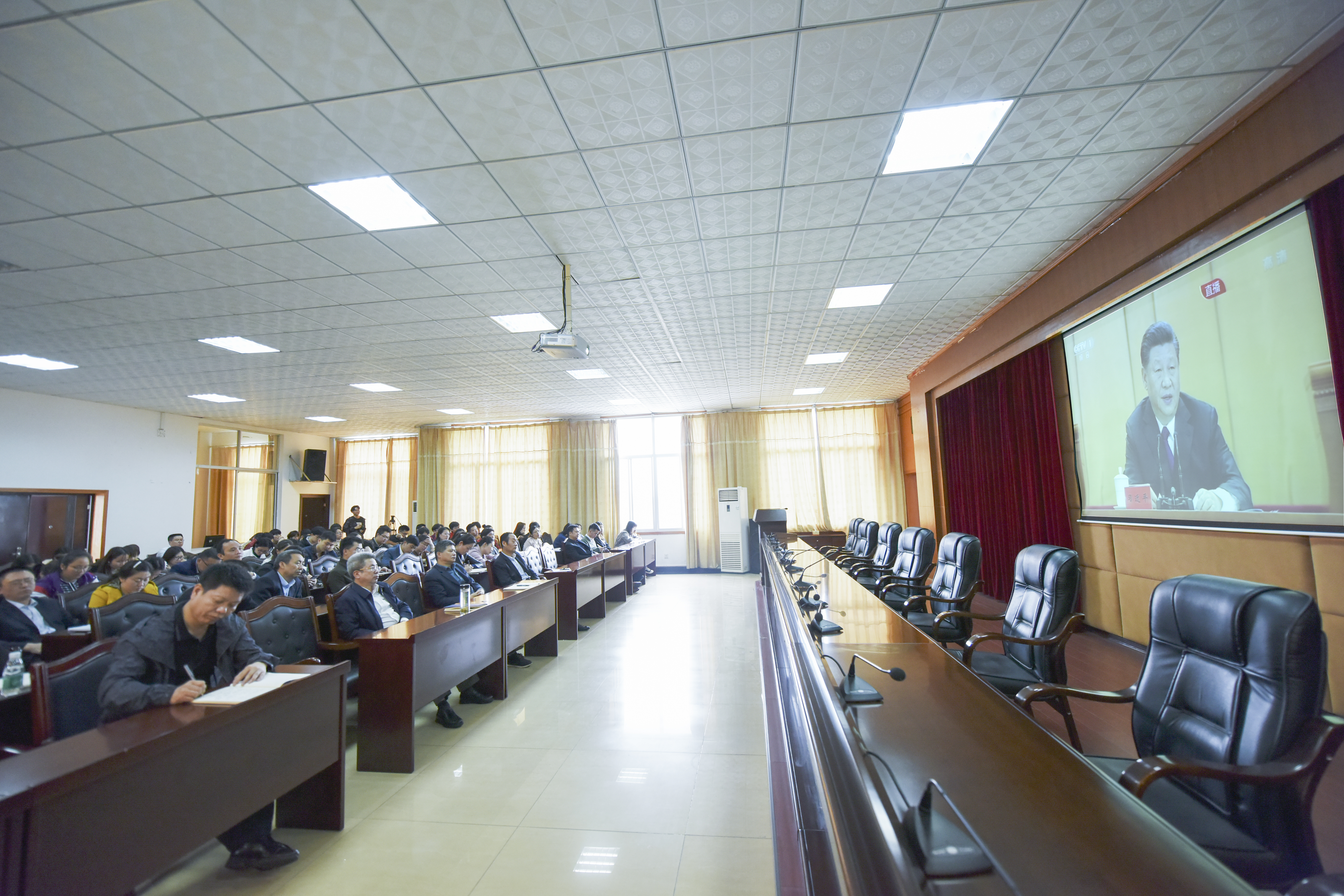 本网讯 4月30日上午10时30分,纪念五四运动100周年大会在人民大会堂举行。中共中央总书记、国家主席、中央军委主席习近平出席大会并发表重要讲话。学校组织集中收看纪念大会直播实况,党委书记、校长曾宝成,党委副书记唐艳明、副校长程智开以及学校直属党组织书记、副书记、全体辅导员和团员青年代表140余人认真聆听学习习近平总书记的重要讲话。