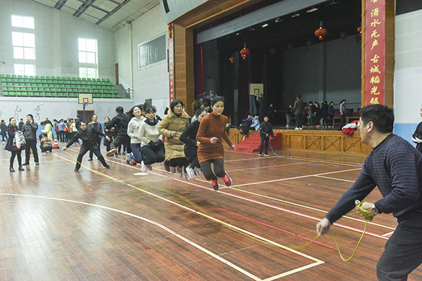 本网讯 3月8日下午,为庆祝“三八”国际妇女节,丰富我校女教职工的业余生活,我校以健康为中心,以活动为纽带,在体育馆举行教职工跳绳比赛。校党委副书记、工会主席唐艳明在现场为职工们加油助威。