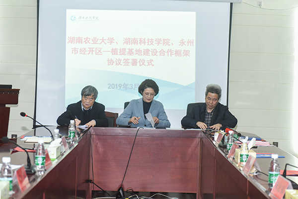 本网讯 3月12日下午,学校与湖南农业大学、永州经开区举行合作签约仪式,共同签订了《湖南农业大学和新利·体育科技支撑永州经开区植提基地建设合作框架协议》。湖南农科院党委书记柏连阳教授,湖南农业大学曾建国教授,永州经开区党委副书记、管委会主任李瑛,校党委书记、校长曾宝成,副校长宋宏福,化学与生物工程学院负责人和相关学科团队负责人参加仪式。仪式由宋宏福主持。