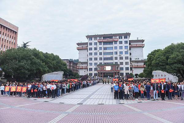 本网讯 10月1日早上7时许,迎着初升的朝阳,鲜艳的五星红旗伴随着庄严的国歌声冉冉升起,全体师生肃立行注目礼,校党委书记陈弘与全场1500余名师生齐声高唱国歌,衷心祝福祖国繁荣昌盛,为伟大祖国喝彩。