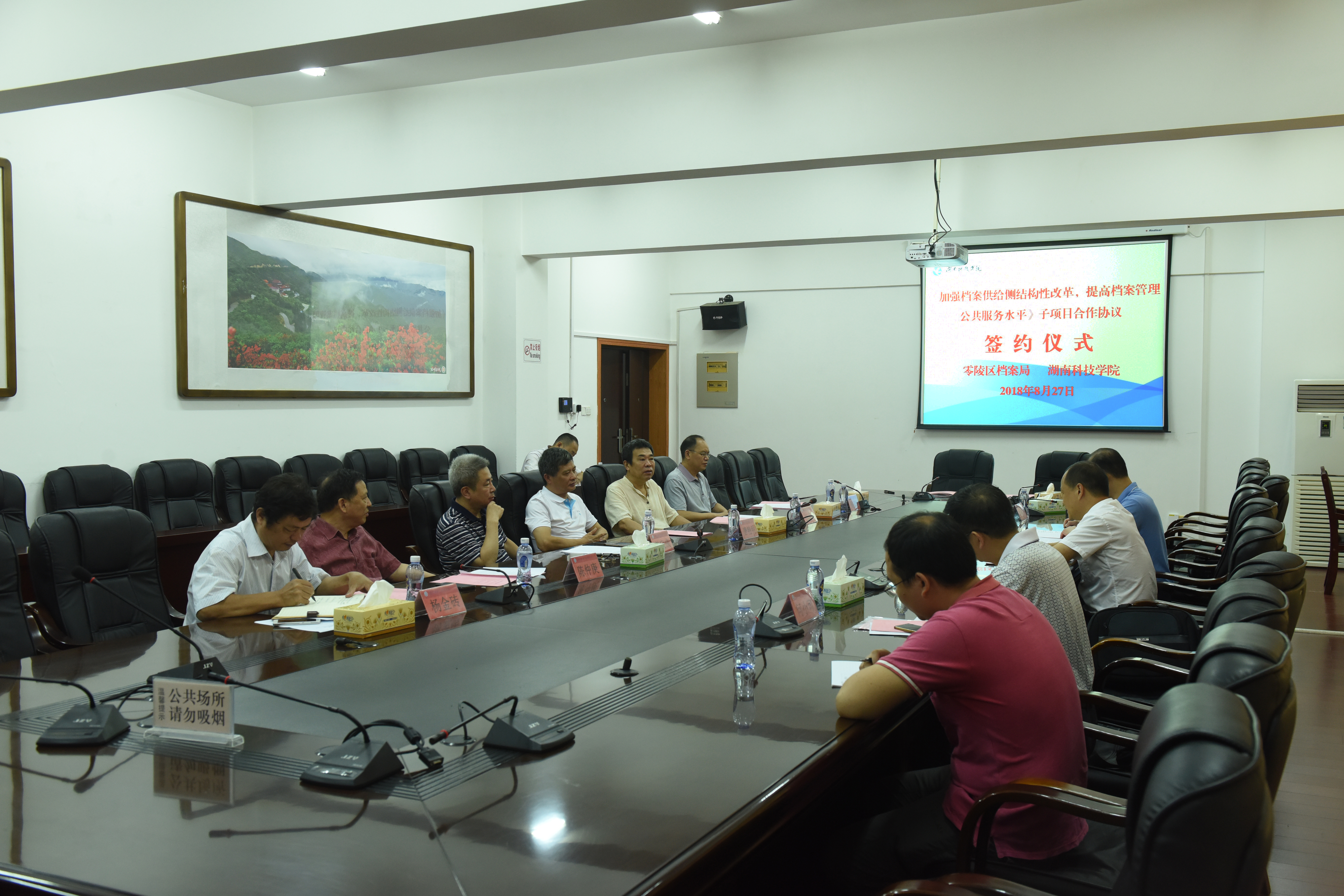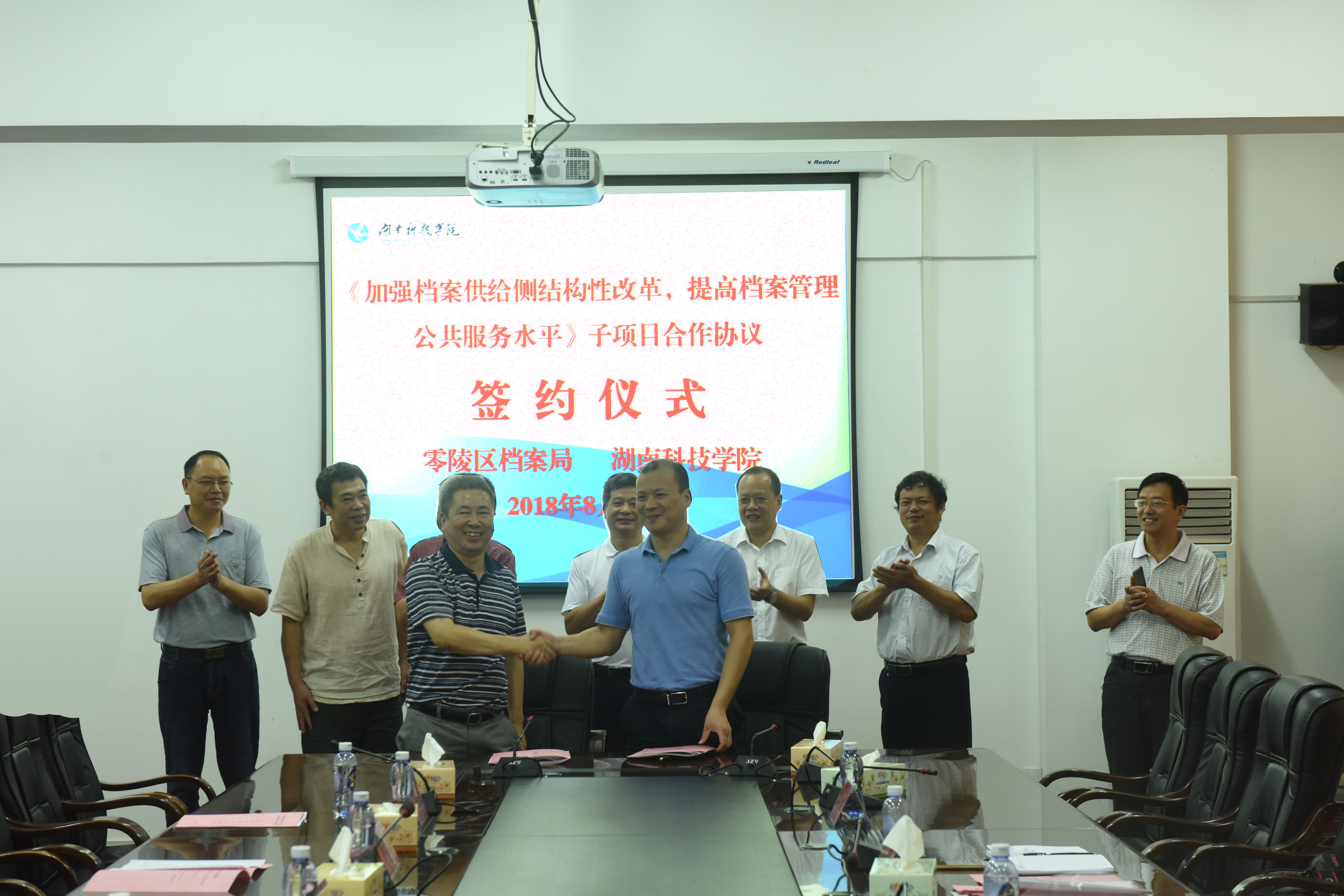 本网讯 8月27日上午,我校与零陵区档案局合作签约仪式在行政楼6楼会议室举行,双方就《加强档案供给侧结构性改革,提高档案管理公共服务水平》的3个子项目的合作展开深入探讨并签订合作协议,合作研究经费共计60万元。零陵区委常委、区委办主任彭江辉,零陵区档案局局长王增荣及有关负责同志,校长曾宝成、校党委副书记唐艳明、各子项目负责人及有关研究人员参加签约仪式,仪式由王增荣主持。