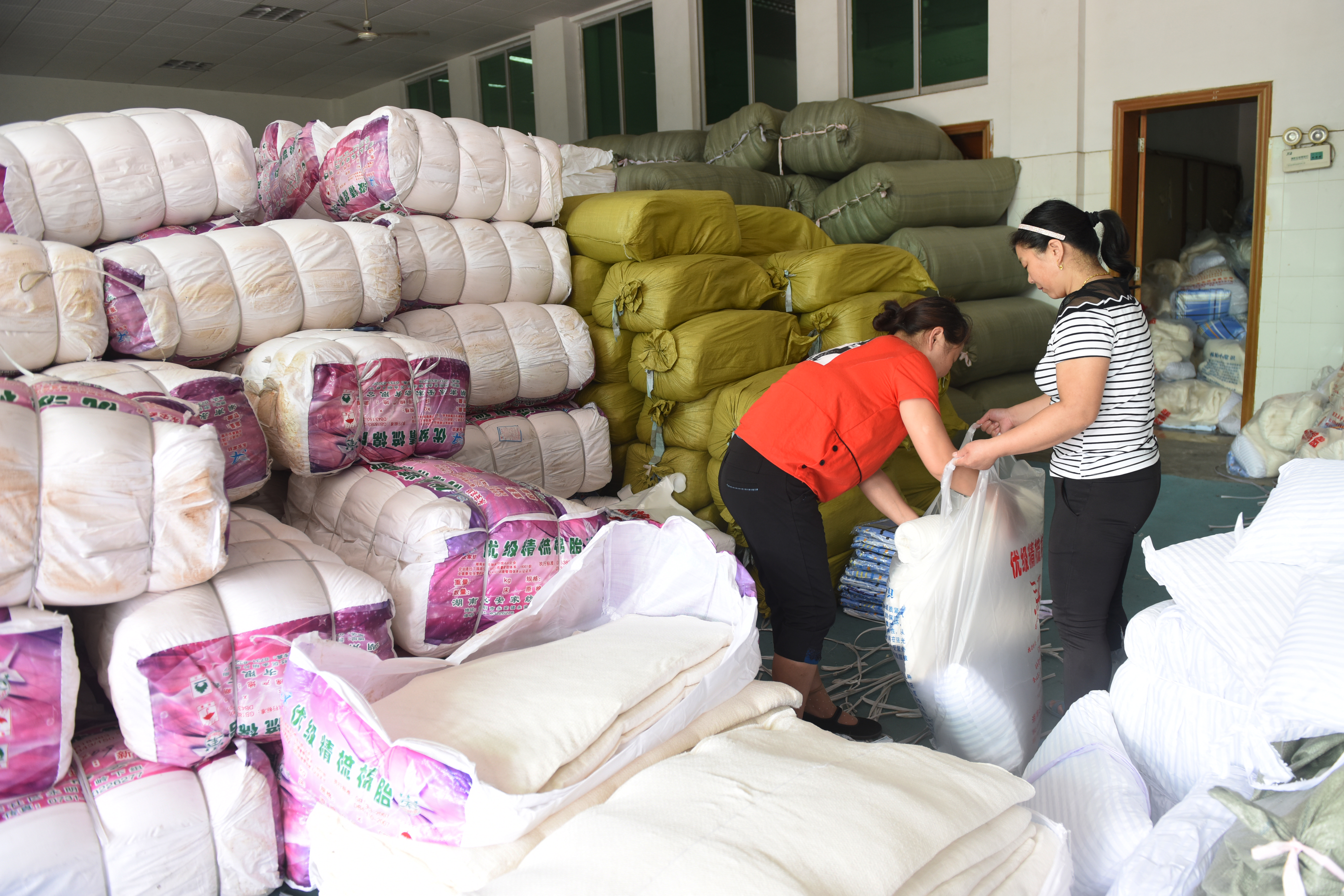在学校体育馆东侧新生床上用品自愿购买处,工作人员正在打包棉被。