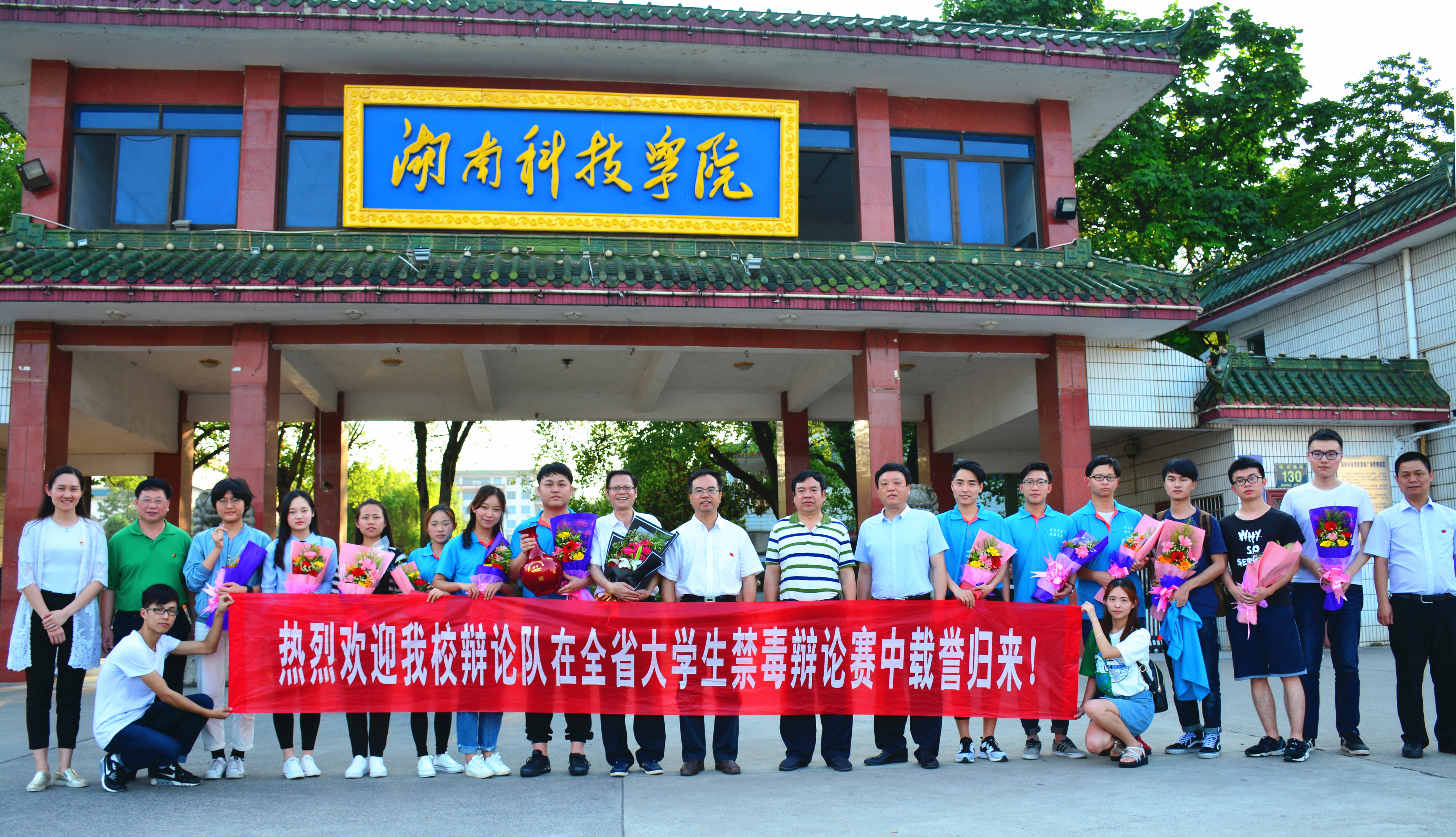 本网讯 5月10日下午,我校辩论队选手在全省大学生禁毒辩论赛中脱颖而出,斩获季军。党委书记陈弘一行在校门口迎接载誉归来的辩手。