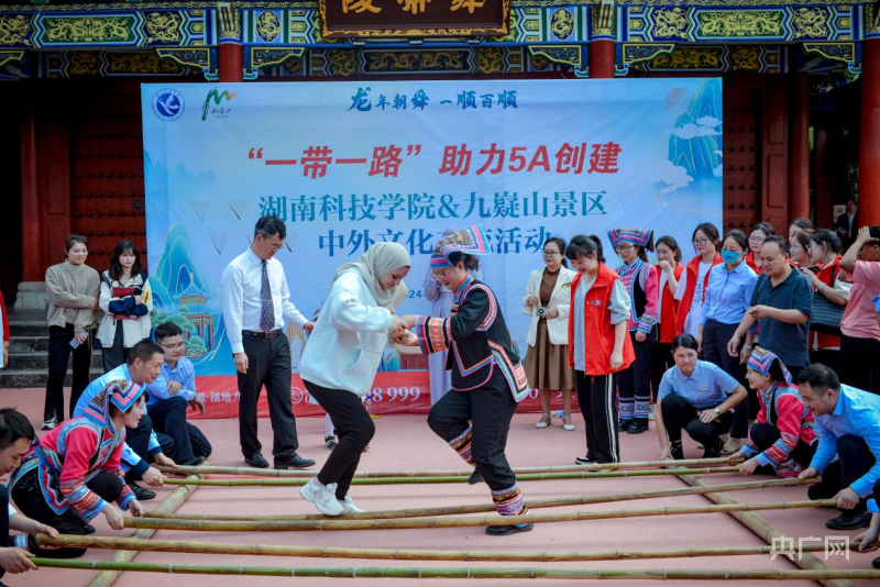 外国学子和瑶族阿妹开心跳起竹竿舞,沉浸式体验九嶷山地方民俗特色(央广网发 李文 供图)