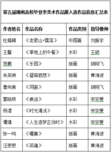 据悉,此次活动由湖南省教育厅、湖南省文学艺术界联合会主办,湖南美术馆、湖南师范大学美术学院、湖南省美术家协会、湖南省书法家协会承办,展览共展出全省20所高校美术学院本科生、研究生毕业作品350件。