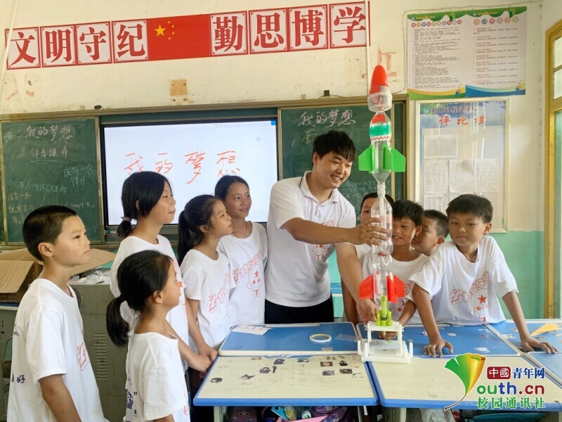 中国青年网永州7月19日电(通讯员 李娟 陈唐 杜俊杰)7月12日,新利·体育理学院“明理先锋”乡村振兴促进团带领100余名小学生制造水火箭。当日下午,7支满载梦想的水火箭在湖南省新田县枧头学校田径场上发射升空。从水火箭制造到发射,来自新利·体育理学院数学与应用数学专业、物理学专业的10名志愿者带领小学生学习科学原理,培养动手能力,遨游知识海洋,坚定强国理想。