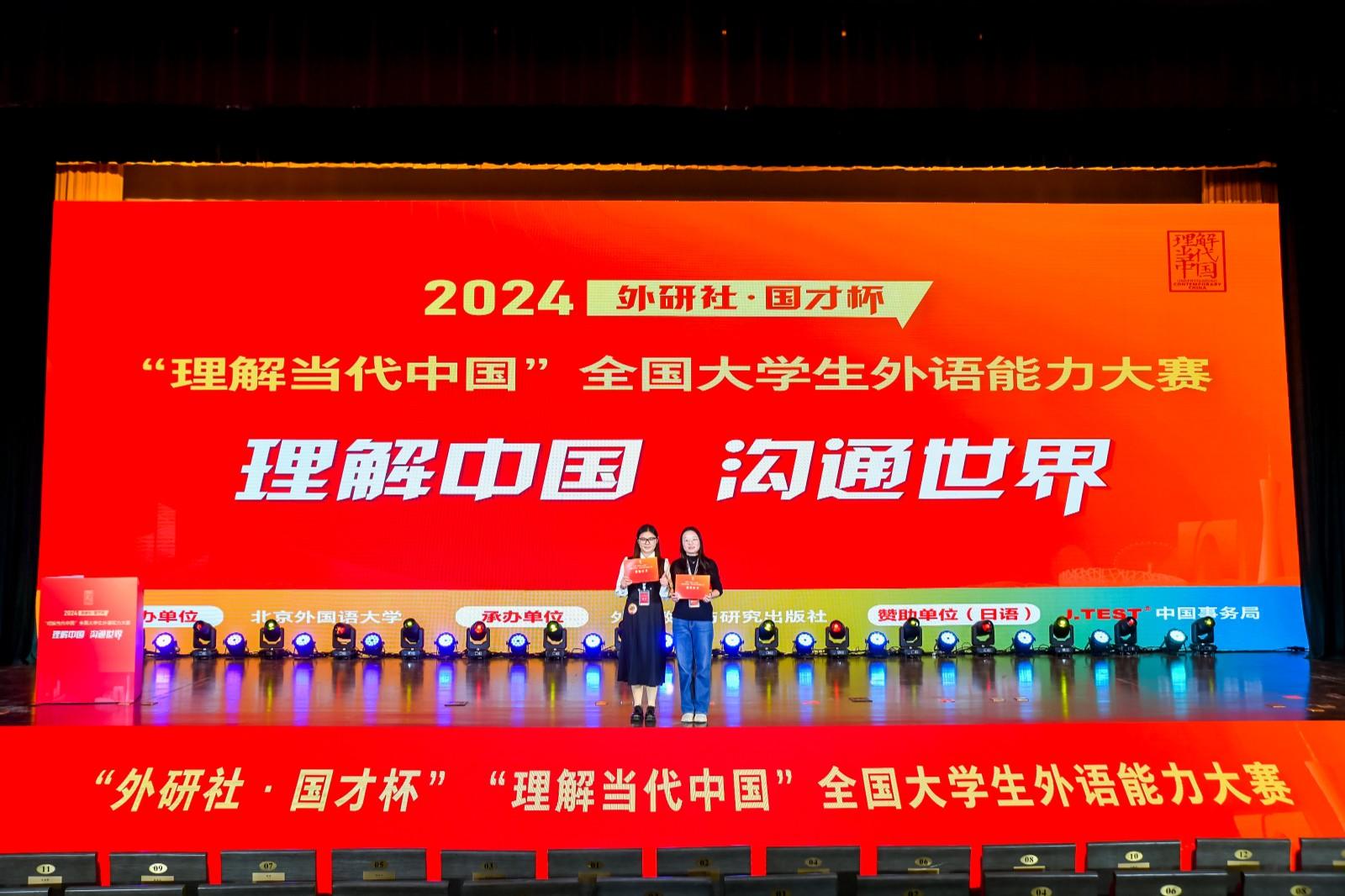 12月7日,2024外研社·国才杯“理解当代中国”全国大学生外语能力大赛全国总决赛落幕,新利·体育外国语学院日语专业学生于璟以第6名的成绩与北京外国语大学、北京大学等高校学子共同荣获日语组赛道的10项金奖。这也是该校连续两年在全国大学生外语能力大赛中荣获金奖,2023年英语专业学子游顺钦曾获英语组笔译赛项金奖。