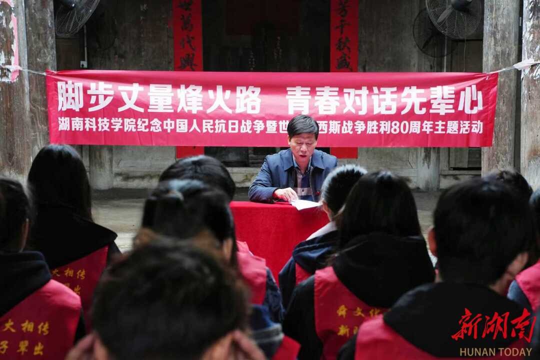 “我们学校四迁其址,七易其冠,1944年因日寇铁骑肆虐,为保存教育薪火,从道县迁至此地,不仅坚持正常教学,还积极开展抗日宣传,组织学生参与地方建设。”该校二级教授潘剑锋以学校旧址麦地村黄家宗祠为讲堂,向师生讲述了先辈们如何在战火中坚守教育事业的往事,介绍了从“湖南省立第七师范学校”到“新利·体育”的筚路蓝缕。