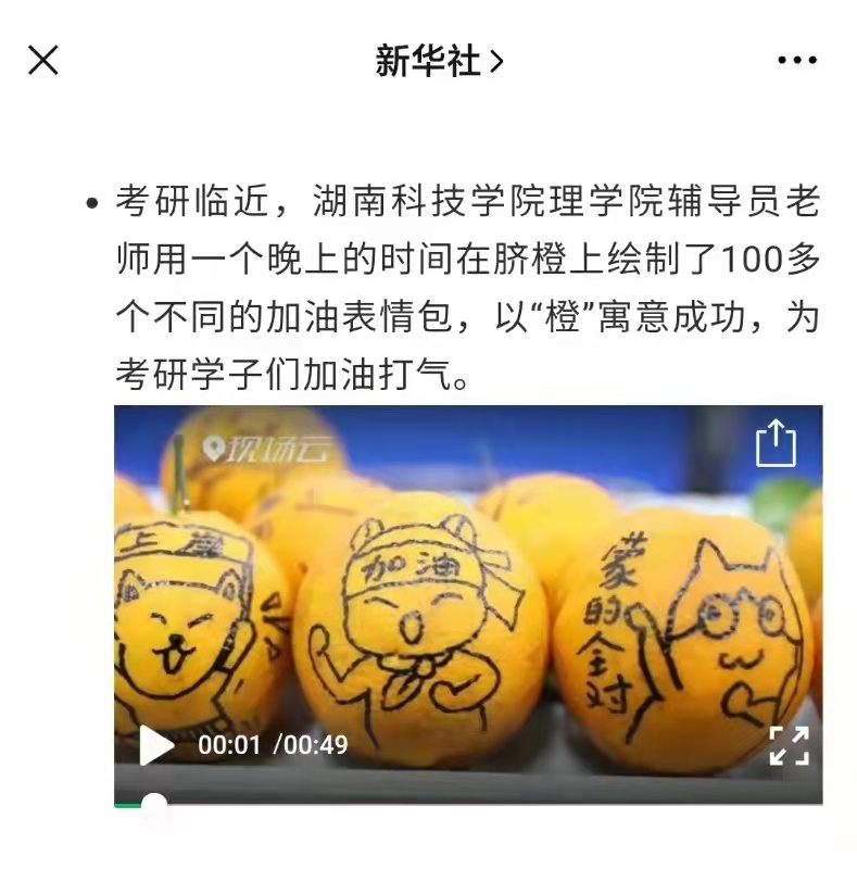 考研临近,新利·体育理学院辅导员老师用一个晚上的时间在脐橙上绘制了100多个不同的加油表情包,以“橙”寓意成功,为考研学子们加油打气。